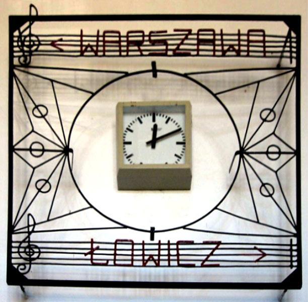PKP Sochaczew. Zegar w budynku dworcowym wskazuje kierunek odjazdu pociągów w stronę Warszawy i w stronę Łowicza.