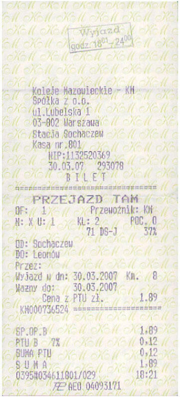 Bilet uczniowski Kolei Mazowieckich zakupiony na stacji Sochaczew. Relacja Sochaczew - Leonów.