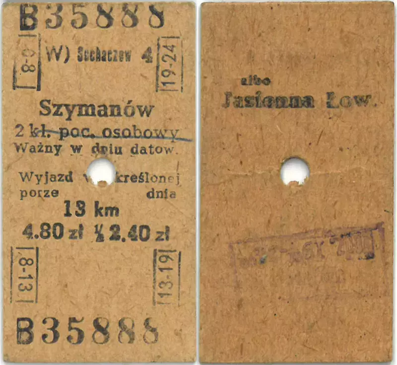 Bilet kartonikowy do Szymanowa (obecnie Teresin Niepokalanów) wydany w kasie na stacji w Sochaczewie. Wyjazd w określonej porze: 19:01-24:00.