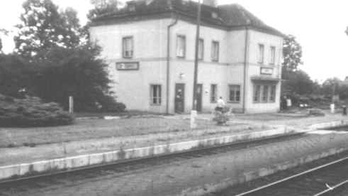 Budynek dworcowy widoczny od strony podjazdu. Tablica z nazwą stacji, sprzed kilkudziesięciu lat. Widok w kierunku Lipna/Sierpca/Nasielska.