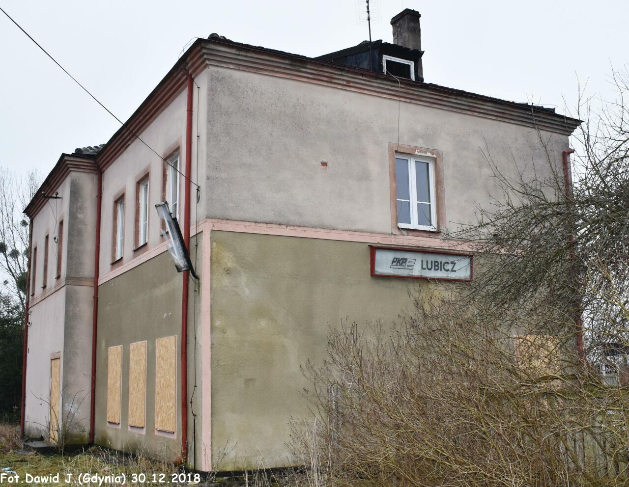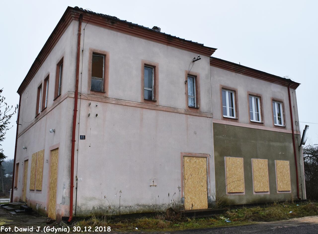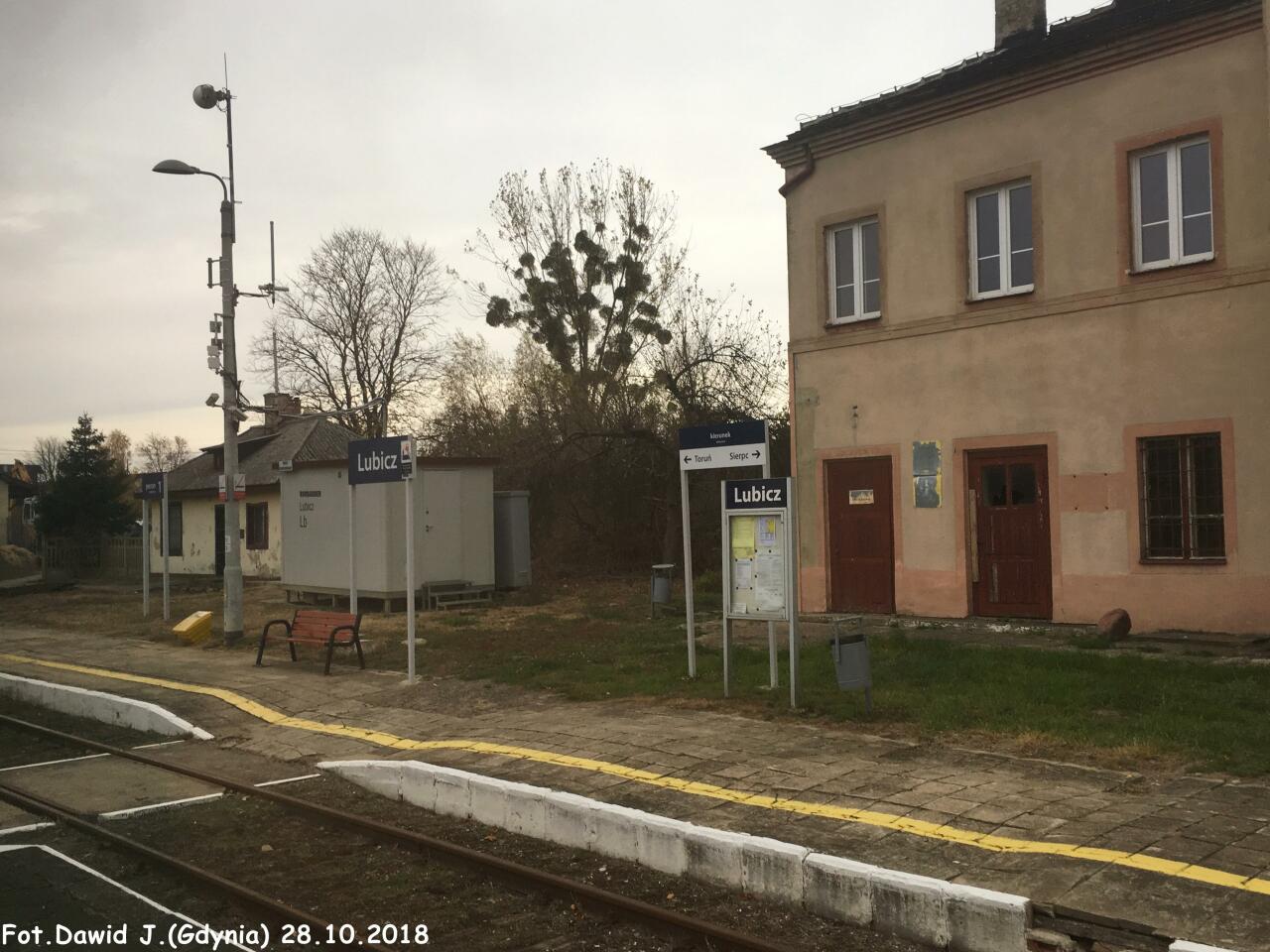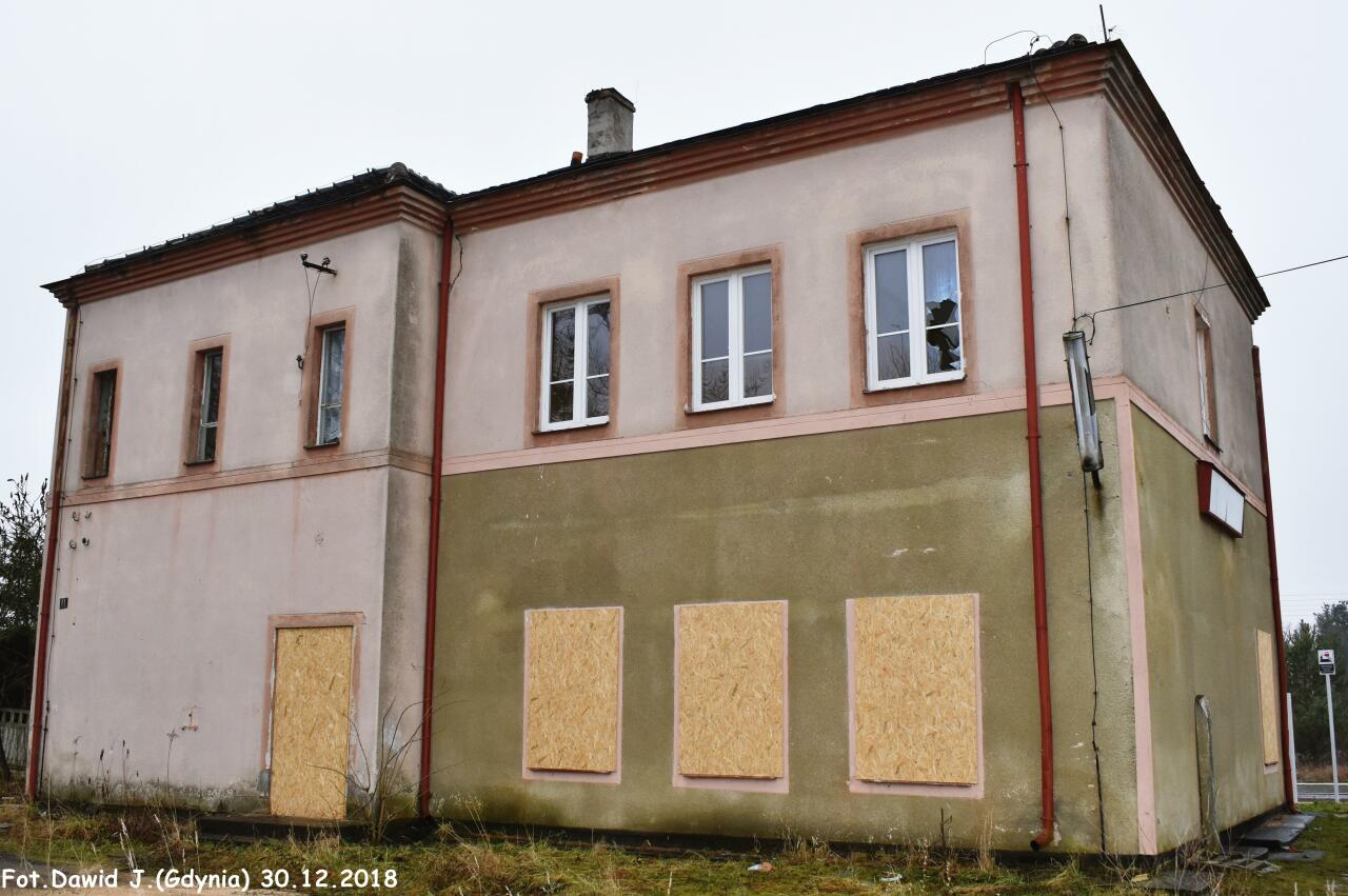 Budynek dworcowy widoczny od strony torów. W budynku znajdowała się nastawnia "Lb". Tablica z nazwą stacji. Zdjęcie ma już charakter historyczny bo podczas drugiej wizyty w dniu 30.12.2018 okna i wejścia w budynku były już dokładnie dobite deskami. Nastawnie "Lb" w budynku zastąpiła zautomatyzowana nastawnia kontenerowa "Lb". W lewo Toruń Wschodni, w prawo Lipno/Sierpc/Nasielsk.