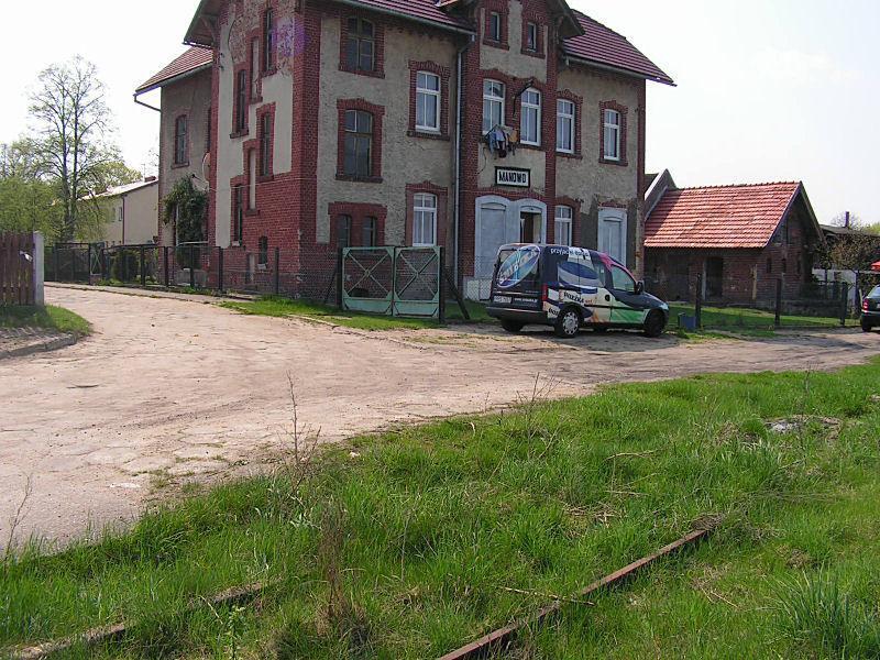 Posterunek odstępowy telefoniczny, przystanek osobowy, ładownia Manowo - budynek stacyjny. W lewo - kierunek Bobolice, w prawo - kierunek Koszalin Wąskotorowy.