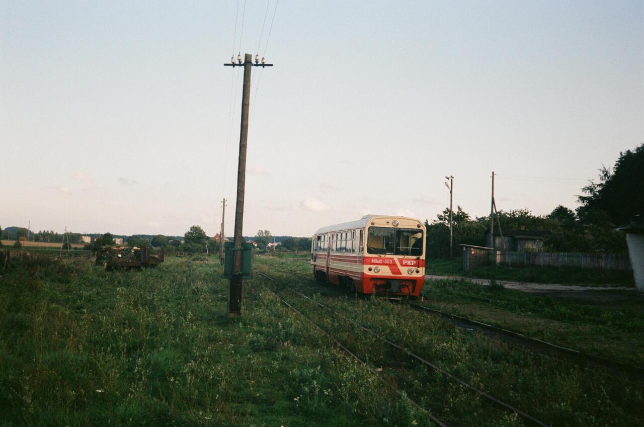 Posterunek odstępowy telefoniczny, przystanek osobowy, ładownia Manowo - na słupie z lewej strony widoczna skrzynka z telefonem do nawiązywania łączności drużyny pociągowej z dyżurnymi ruchu stacji Koszalin Wąskotorowy i Świelino, pociąg MM 628 relacji Świelino - Koszalin Wąskotorowy, obsługiwany wagonem spalinowym MBxd2-303, widok w kierunku stacji Bobolice.