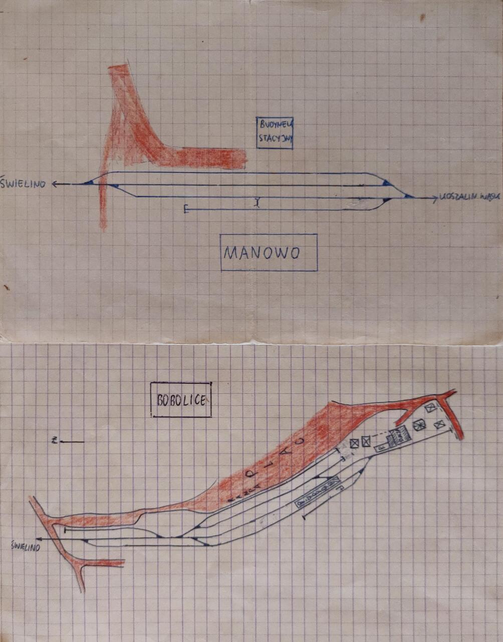 Schematy uproszczone: posterunek odstępowy telefoniczny, przystanek osobowy, ładownia Manowo, stacja Bobolice. Stan - 1989 rok.