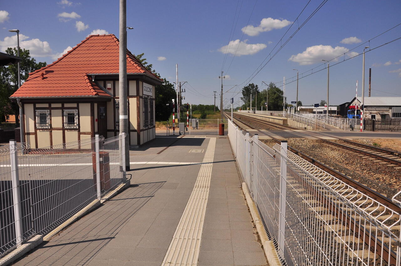 Niewielka miejscowość Golęczewo ma ciekawą historię. Położona 15 km na północ od Poznania posiada ponad 40 obiektów wpisanych do rejestru zabytków. Wszystko za sprawą polityki germanizacyjnej. Wieś stanowi przykład głęboko przemyślanej realizacji urbanistycznej, na którą cesarz Wilhelm II nie szczędził środków finansowych. Całość została zaplanowana i wybudowana przez Komisję Kolonizacyjną jako wzorcowa wieś niemiecka. Miała pełnić funkcję propagandową – zachęcać mieszkańców zachodnich rejonów Prus do translokacji na wschód. Wybudowano tu kościół, szkołę, kuźnię, straż pożarną, własne wodociągi z wieżą wodną napędzaną wiatrakiem (sic!), gospodę, oczywiście stację kolejową i wiele innych obiektów pozwalających stworzyć samowystarczalną miejscowość. Opis ogólny stacji: występują tarcze ostrzegawcze przejazdowe (info: Bronisław Childczyński, 2005-07-09). Około 2020r. stacja przeszła bardzo gruntowny remont. (info Przemysław Warczyński, 2021-0529). |