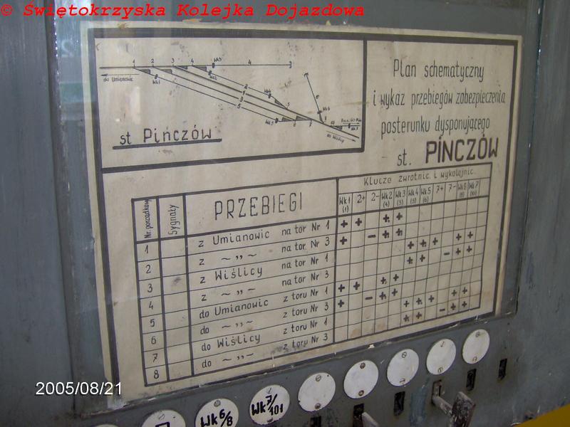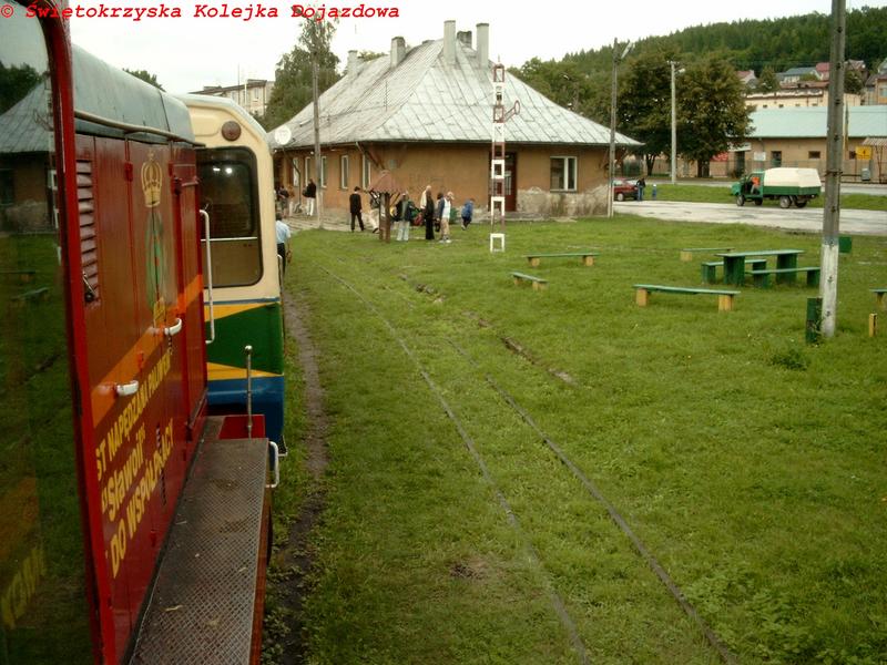 Stacja (nieczynna), przystanek osobowy Pińczów - pociąg MS 2604 relacji Wiślica - Jędrzejów Wąskotorowy, prowadzony lokomotywą Lxd2-333 wjeżdża na stację (zdjęcie wykonano w miejscu odgałęzienia nieczynnej bocznicy stacyjnej do GS "Pińczów"). W lewo - kierunek Umianowice, w prawo - kierunek Wiślica.