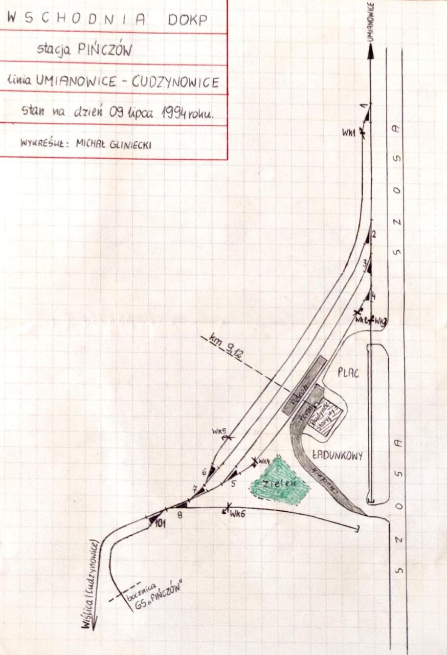 Przystanek osobowy Pińczów - schemat stacji (nieczynna). Stan na dzień 9 lipca 1994 roku.