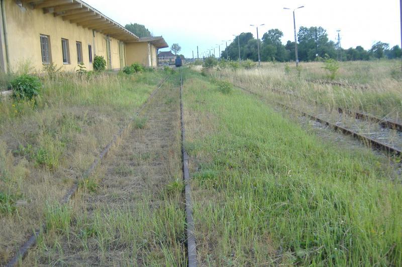 Południowa głowica, widok w kierunku stacji, po prawej budynek stacyjny a dalej wciąż czynny magazyn.