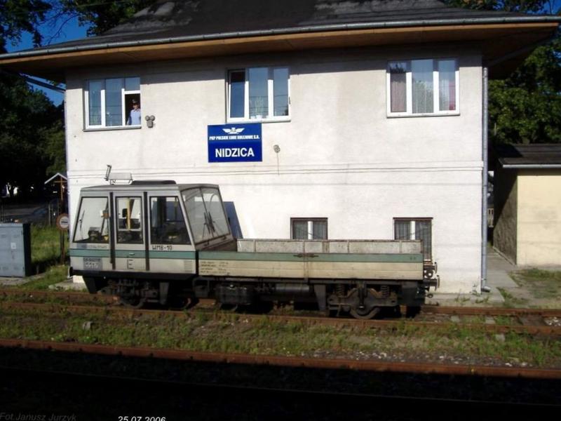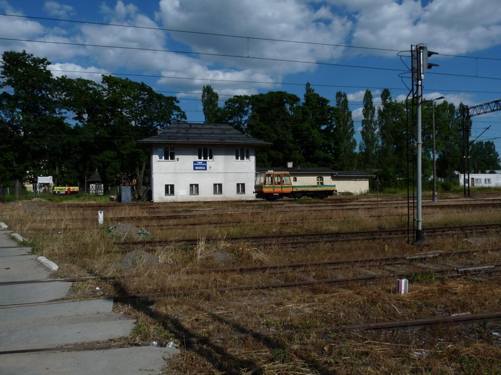 Wózek motorowy WM8-10 na tle nastawni w Nidzicy, z okna pociągu posp. relacji. Olsztyn Gł.-W-wa Zachodnia. Widok w kierunku wschodnim; w prawo perony, w lewo Wielbark, Olsztynek/Olsztyn.