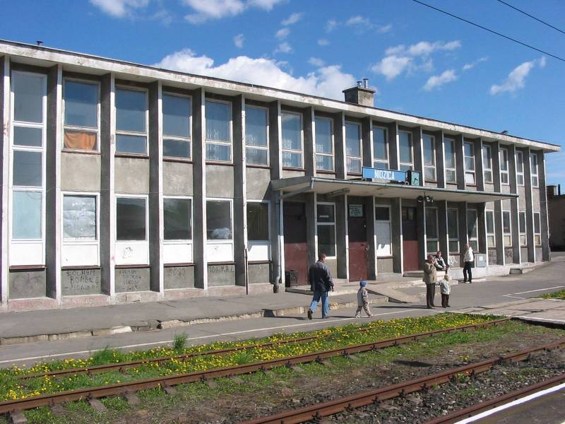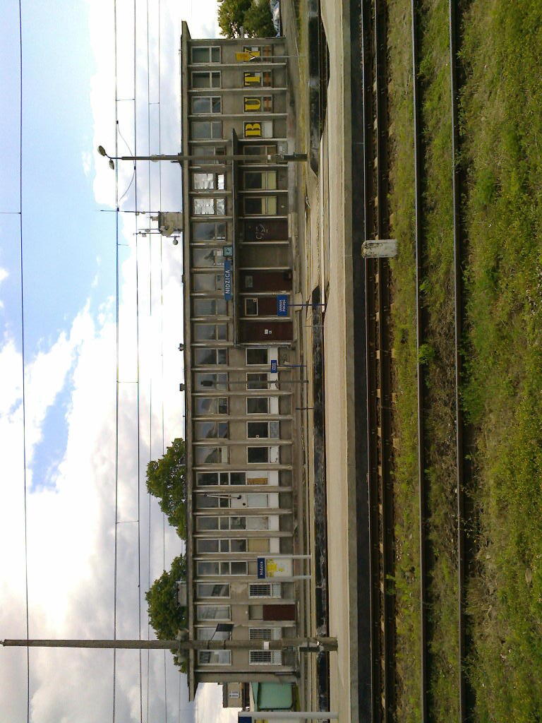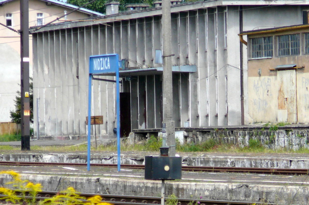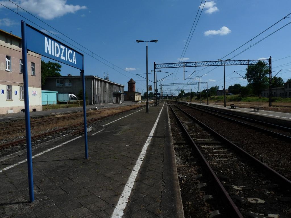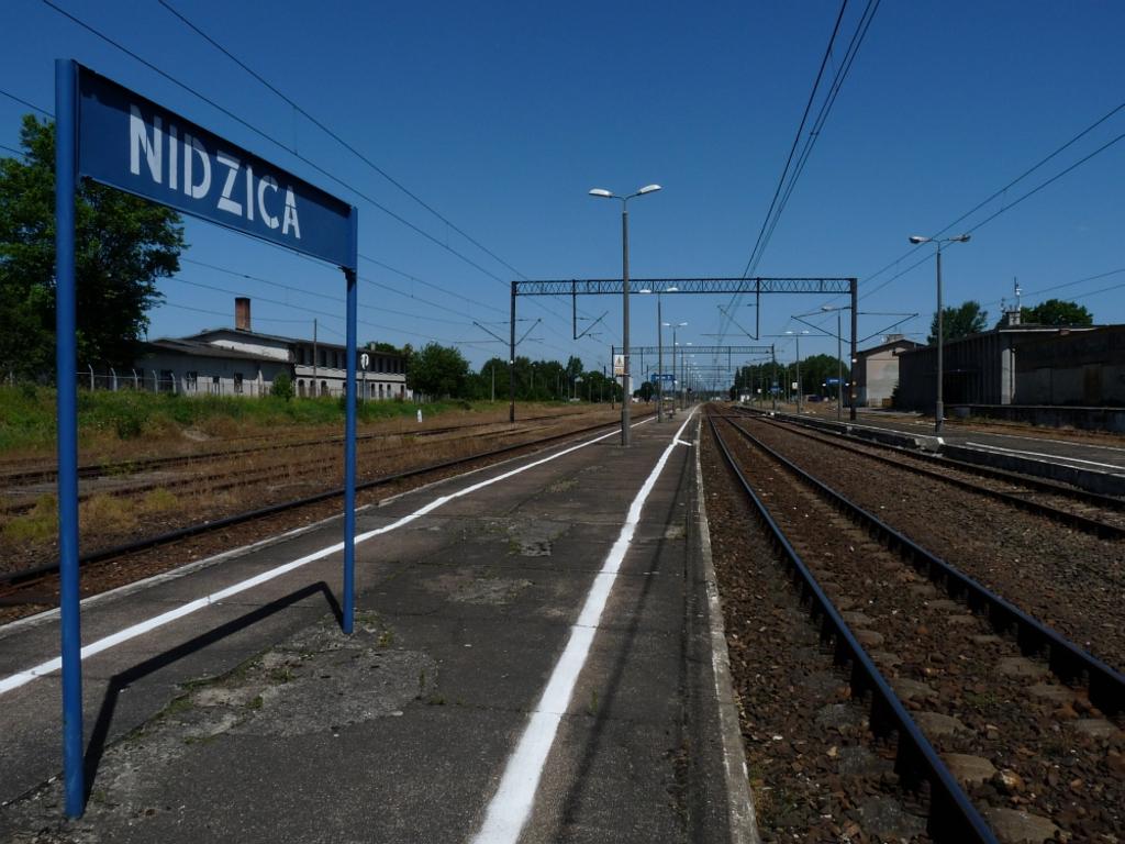 Dworzec PKP w Nidzicy od strony peronów. Widok w kierunku wschodnim: prawo Działdowo, w lewo Olsztynek/Olsztyn i Wielbark.