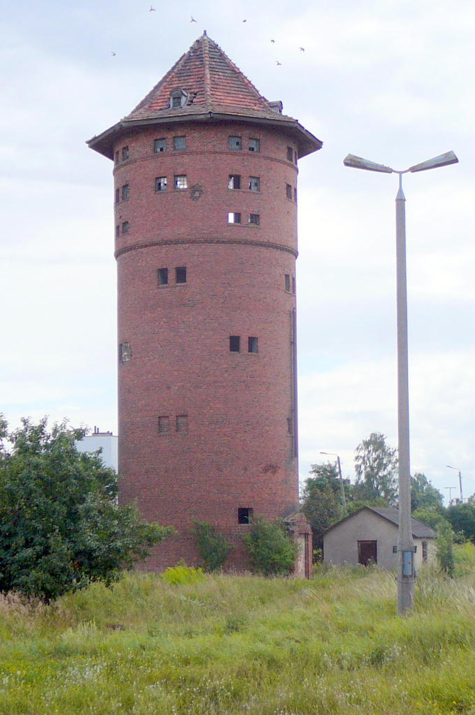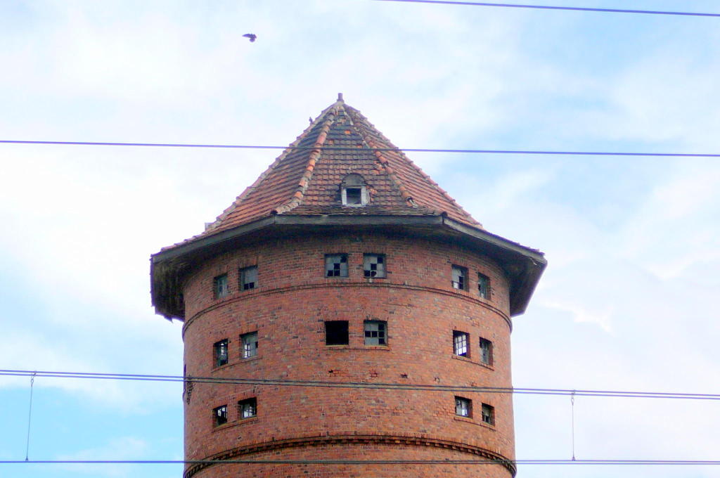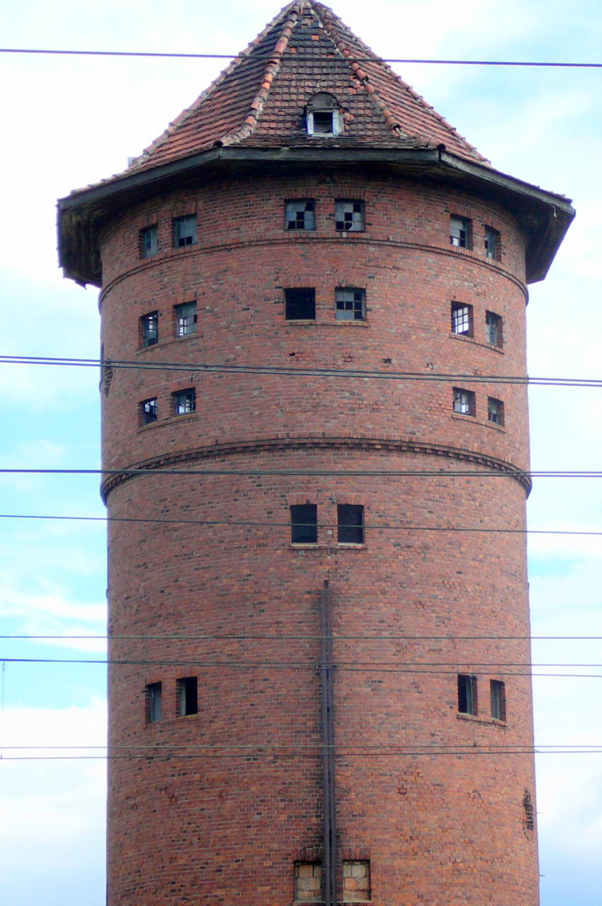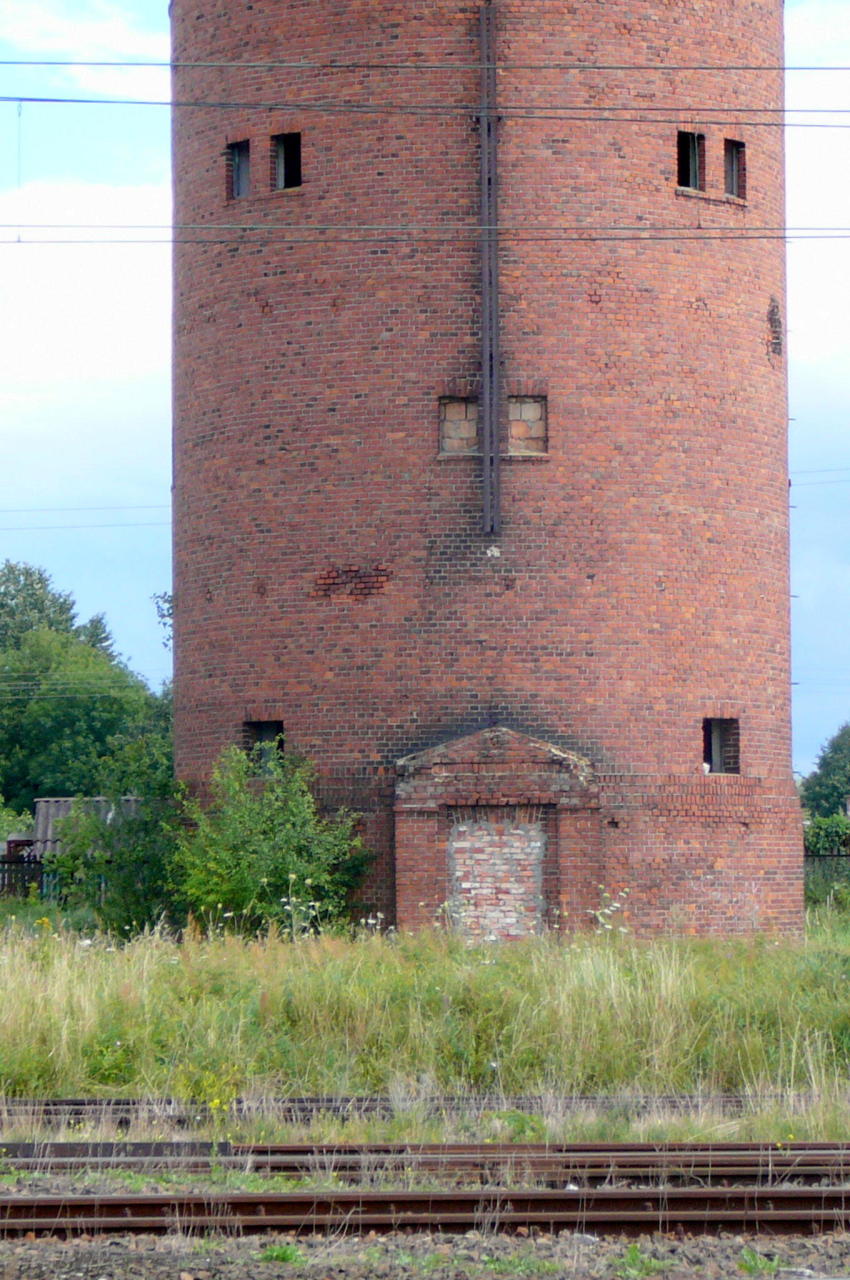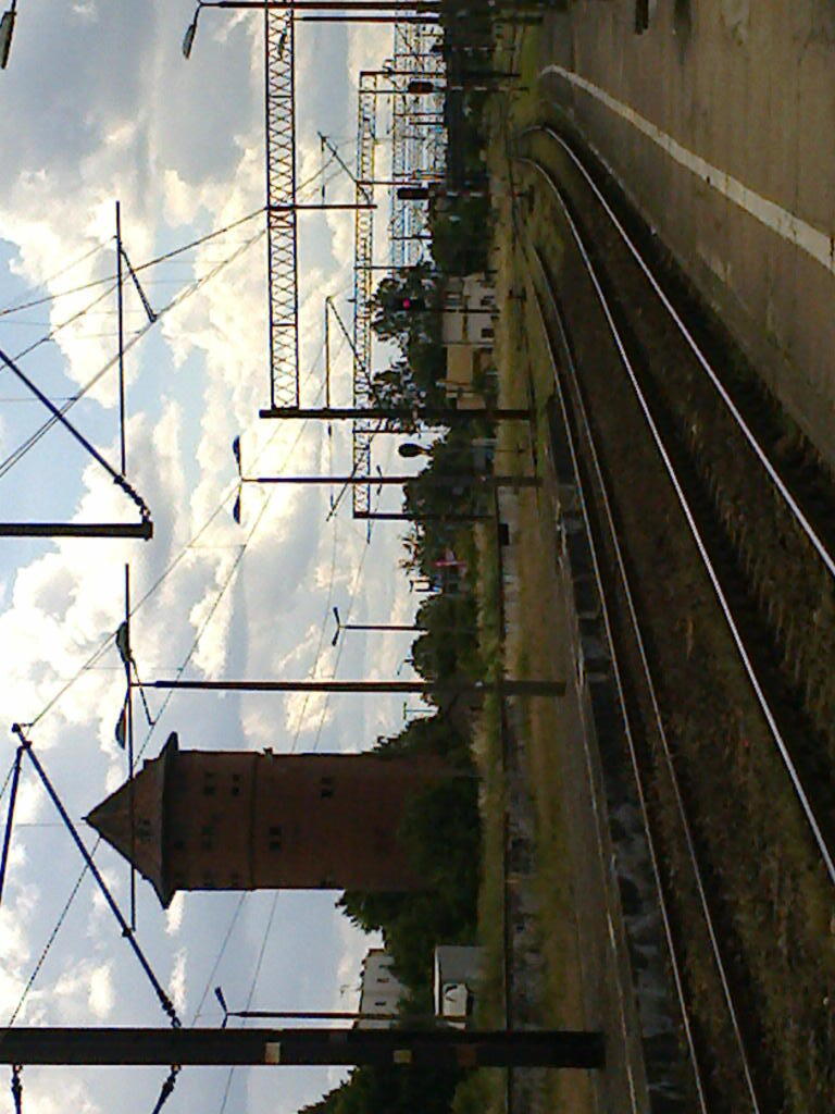 Nidzica. Kolejowa wieża wodna. Widok zza torów w kierunku wschodnim; w lewo perony, w prawo Działdowo.