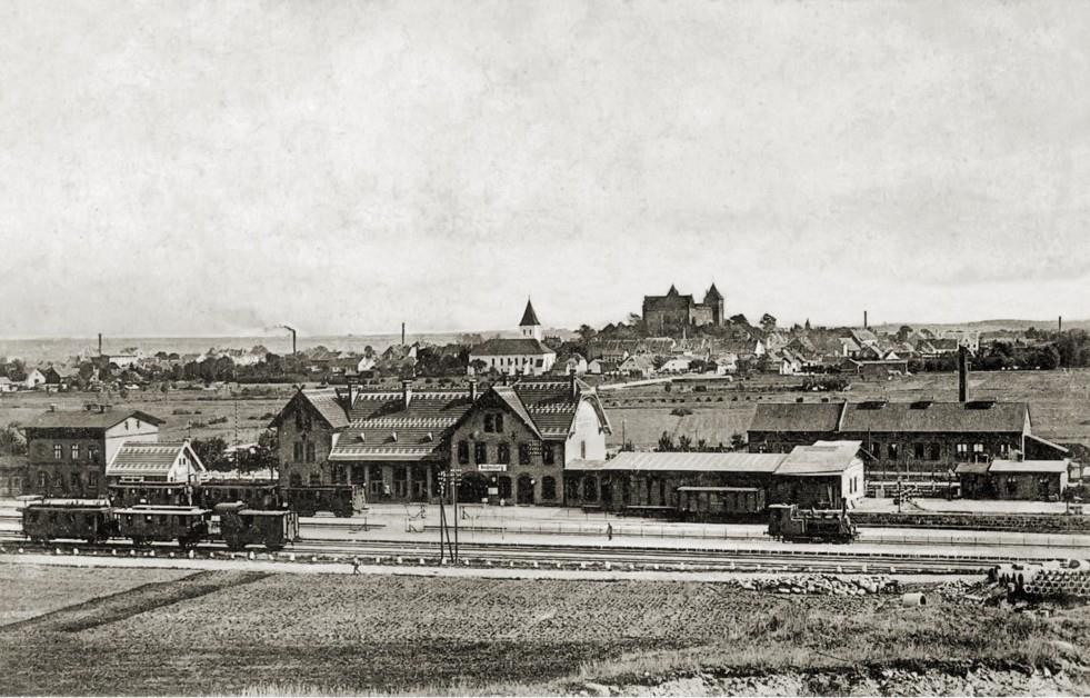 Stacja kolejowa w Nidzicy. Z lewej perony i budynek dworca, z prawej magazyn towarowy. Datowanie wg strony FB Prusy Wschodnie wczoraj i dziś. Widok w kierunku wschodnim: w prawo Działdowo, w lewo Olsztynek/Olsztyn i Wielbark. W tle, na górce zamek krzyżacki.