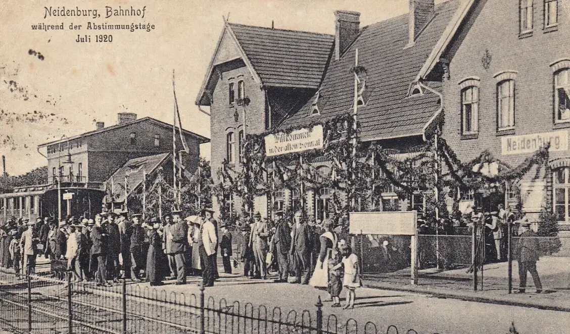Dworzec w Nidzicy w okresie plebiscytu, w sprawie przynależności okolicy do Niemiec lub Polski (opcja niemiecka odniosła przytłaczające zwycięstwo). Widok w kierunku północno-wschodnim: w prawo Działdowo, w lewo Olsztynek/Olsztyn i Wielbark.
