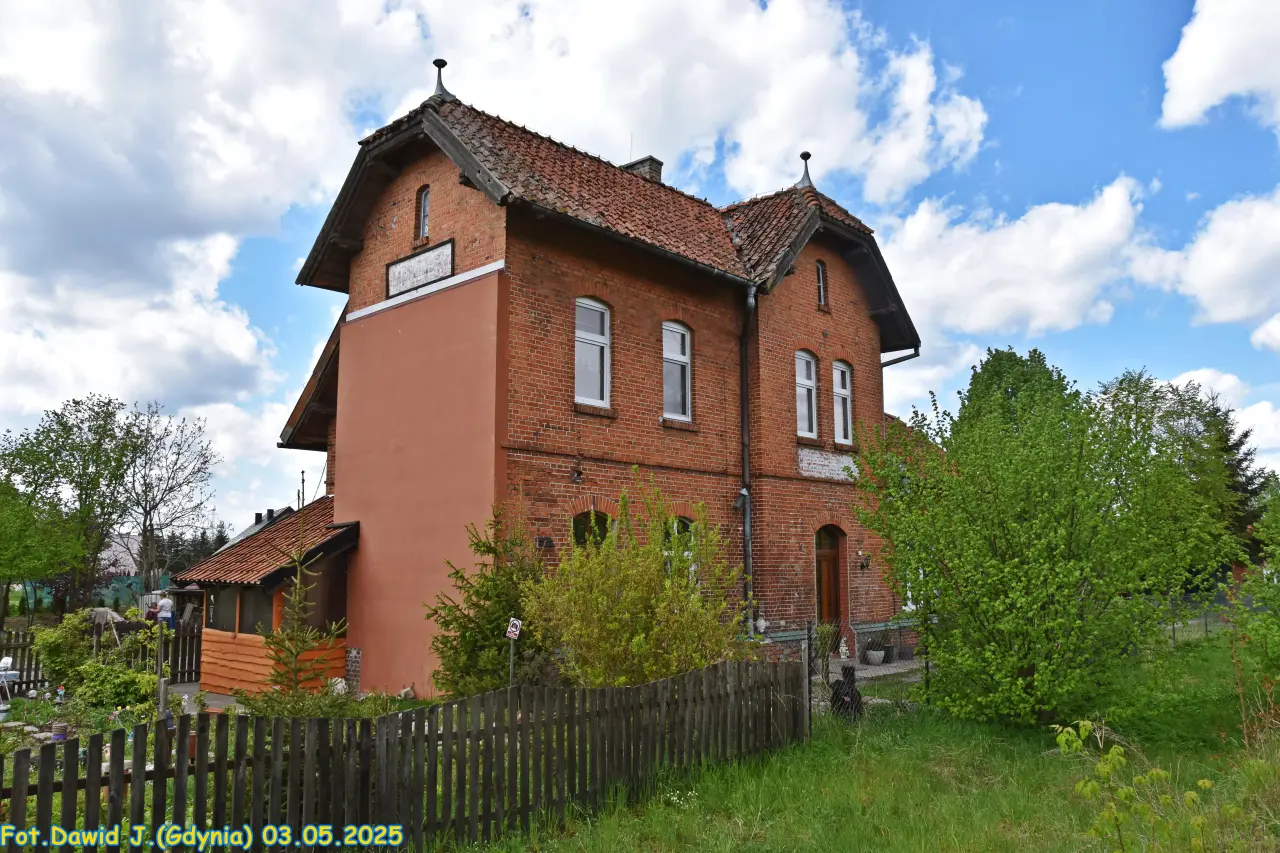 | 2005-08: Dwa tory dodatkowe zamknięte wykolejnicami. Prawdopodobnie była mijanka plus jeden tor ładunkowy. W północnej głowicy resztki fundamentu żurawia wodnego. Budynek w całości mieszkalny. Na budynku widoczne resztki niemieckiej nazwy (info: Marek Zienkowicz). |