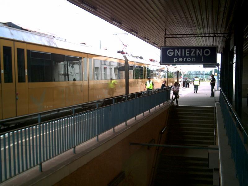 Opis ogólny: Linią w kierunku Wrześni, Jarocina, Oleśnicy, i Wroclawia kursują pociągi towarowe i osobowe (również pospieszne do Wroclawia omijające Poznań krótszą trasą). Od 2005 roku z inicjatywy Urzędu Marszalkowskiego w Poznaniu kursuje "szynobus" do Leszna przez Wrześnię i Jarocin. Linia wąskotorowa do Anastazewa rozpoczyna się na niezależnej stacji czolowej. (info: 2005-03-15) Do końca lat 90-tych XX wieku jedna z większych stacji węzlowych w Polsce. Sklada się z dworca osobowego (lokalizacja: centrum miasta - ruch lokalny, miedzyreginalny i międzymarodowy), stacji towarowej, stacji rozrządowej, Zakladu Taboru (dwie lokomotywownie, obecnie w likwidacji). Część torów postojowych rozebrano. Na poludniowy-wschód ponad 100 ha terenów przeznaczonych pod przemysl, cala poludniowa okolica stacji to jedna, wielka dzielnica przemyslowa. Jest więc możliwość rozwoju kolejowego transportu towarowego. Dworzec osobowy bardzo czysty, zadbany. Od polowy lat 80-tych dwa gruntowne remonty, ostatni w 1996 roku. Kilka kas biletowych, punkty handlowe, restauracja, poczekalnia. Obok duży Dworzec Autobusowy i węzel komunikacji miejskiej. (info: M. S, 2005-03-15) Stacja Gniezno wyposażona jest w semafory świetlne i kształtowe. (info: M. S, 2006-05-15) info: od 1 listopada 2009 zamknięto restaurację, od 1 grudnia 2009 kasy biletowe czynne tylko w godz. 5-21:00, od stycznia 2010 dworzec PKP będzie całkowicie zamknięty w nocy, w godz 23-4, (info: Sławek, 2009-12-14)Stacja posiada 3 perony główne [1,2,3] oraz jeden peron pomocniczy, jednokrawedziowy, czołowy - nieużywany w ruchu liniowym - [1a]. Perony posiadają łącznie 6 krawędzi. Peron [1a] jest przedłużeniem peronu [1], podobnie jak kilka peronów na stacji Poznań Główny. Peron [1a] nie jest obecnie używany [obsługiwał linie do Skoków] jednak jest wyposażony i utrzymywany przez PKP jak pozostałe perony - posiada miedzy innymi podświetlany kaseton informacyjny z napisem "GNIEZNO Peron 1a" oraz sterowana automatycznie tablice informacyjna odjazdów pociągów. Peron [1a] posiada tez nawierzchnie i linie bezpieczeństwa, podobnie jak pozostałe perony. (info: combichrist, 19-04-2010) W 2011 roku węzeł kolejowy "Gniezno" praktycznie przestał istnieć. Po likwidacji przez Wielkopolski Urząd Marszałkowski ostatnich połączeń na linii do Wrześni, dawny osobowy dworzec kolejowy zmienił się w prowincjonalny przystanek na linii z Poznania do Inowrocławia. Dworzec towarowy nie działa od dawna. Zakłady Taboru nie istnieją. PKP rozebrało 3 z 6 grup torów. Przeznaczono do likwidacji kolejną grupe torów rozrządowo - postojowych w południowej części kompleksu. Miasto Gniezno pracuje nad sporządzeniem miejscowych planów zagospodarowania przestrzennego terenów zdewastowaanych przez PKP - mają być przekazane samorządowi za długi. (info: avalon, 19-12-2011) PKP kończy rozbierać kolejną grupę torów stacji rozrządowej, stacja towarowa juz nie istnieje, zakład taboru jest zdewastowany i czeka go rozbiórka lub sprzedaż pod inne cele. Pierwszy raz w historii zlikwidowano połączenia osobowe w kierunku Wrześni. Linia w kierunku Wrzesni i Jarocina jest używana sporadycznie przez składy towarowe. Czynnych jest już tylko kilka torów postojowych dla składów towarowych. Używane sa tylko dwa perony. (info: avalon, 26-02-2013) Opis infrastruktury: Perony na stacji Gniezno: 1: "Peron 1" - Jednokrawędziowy, przylegający do budynku dworcowego. Wiata nad peronem, kasetony informacyjne, krzesełka dla podróżnych. Obsługiwał ruch osobowy w kierunku Nakła n/Notecią, obecnie w kierunku Poznania. 2: "Peron 1a" - Jednokrawędziowy, przedłużenie peronu 1. Obsługiwał pociągi w kierunku Sławy Wlkp. Obecnie używany sporadycznie. 3: "Peron 2" - Dwukrawędziowy peron międzytorowy. Wiata nad peronem, kasetony informacyjne, krzesełka dla podróżnych. Obsługuje większość pociągów w kierunku Poznania, Wrocławia, Torunia, Bydgoszczy, Olsztyna, Ełku oraz międzynarodowe do Berlina Licht. i Kaliningradu. Biuro Dyżurnego Ruchu. 4: "Peron 3" - Dwukrawędziowy peron międzytorowy. Wiata nad peronem, kasetony informacyjne, krzesełka dla podróżnych. Obsługuje większość pociągów w kierunku Wrześni, Jarocina oraz Leszna. Biuro Dyżurnego Ruchu. Perony 1, 2, 3 łączy tunel zaczynający się pod wiatą peronu 1. Na każdym peronie dwustronne wyjścia z tunelu. (info: M. S, 2006-05-15) Większość torów postojowych, manewrowych i rozrządowych jest obecnie używana tylko sporadycznie. Wiele z nich zostało już rozebranych - niegdyś duża stacja Gniezno zmienia się w zapyziały przystanek kolejowy. (info: combichrist, 19-04-2010) Pozostałe tory rozrządowe i postojowe służą już tylko jako składowisko złomu. Są przeznaczone do rozbiórki. (info: avalon, 19-12-2011) Opis budynków: Tzw "lokomotywownia" Zakladu Taboru PKP została zamknięta ostatecznie w 2009 roku - od tego czasu budynki tego zespołu naprawczego zmieniają się w ruinę. Być możne na miejscu dawnego ZT powstanie centrum handlowe. (info: combichrist, 19-04-2010) PKP porzuciła większość istniejących budynków co miało wpływ na ich późniejszą dewastacje. Budynek poczekalni przystanku osobowego podobno ma być odnowiony. Kasa czynna tylko w ciągu dnia. (info: avalon, 19-12-2011) PKP rozpoczyna remont budynku stacji kolejowej. Z dokumentacji dostępnej na stronie PKP wynika, że większą cześć dawnej stacji kolejowej przejmie Miejski Ośrodek Pomocy Społecznej w Gnieźnie. Poczekalnia, wc, kiosk i kasa biletowa kolejowego przystanku osobowego będą się mieściły w jednym pomieszczeniu które jest teraz używane jako poczekalnia. (info: avalon, 26-02-2013) W latach 70 XIX wieku planowano budowę linii z Gniezna do Bydgoszczy przez Barcin i Łabiszyn która łączyłaby się z torami Inowrocław - Bydgoszcz w okolicach podbydgoskiej Zielonki. Ostatecznie jednak zbudowano tory do Cho