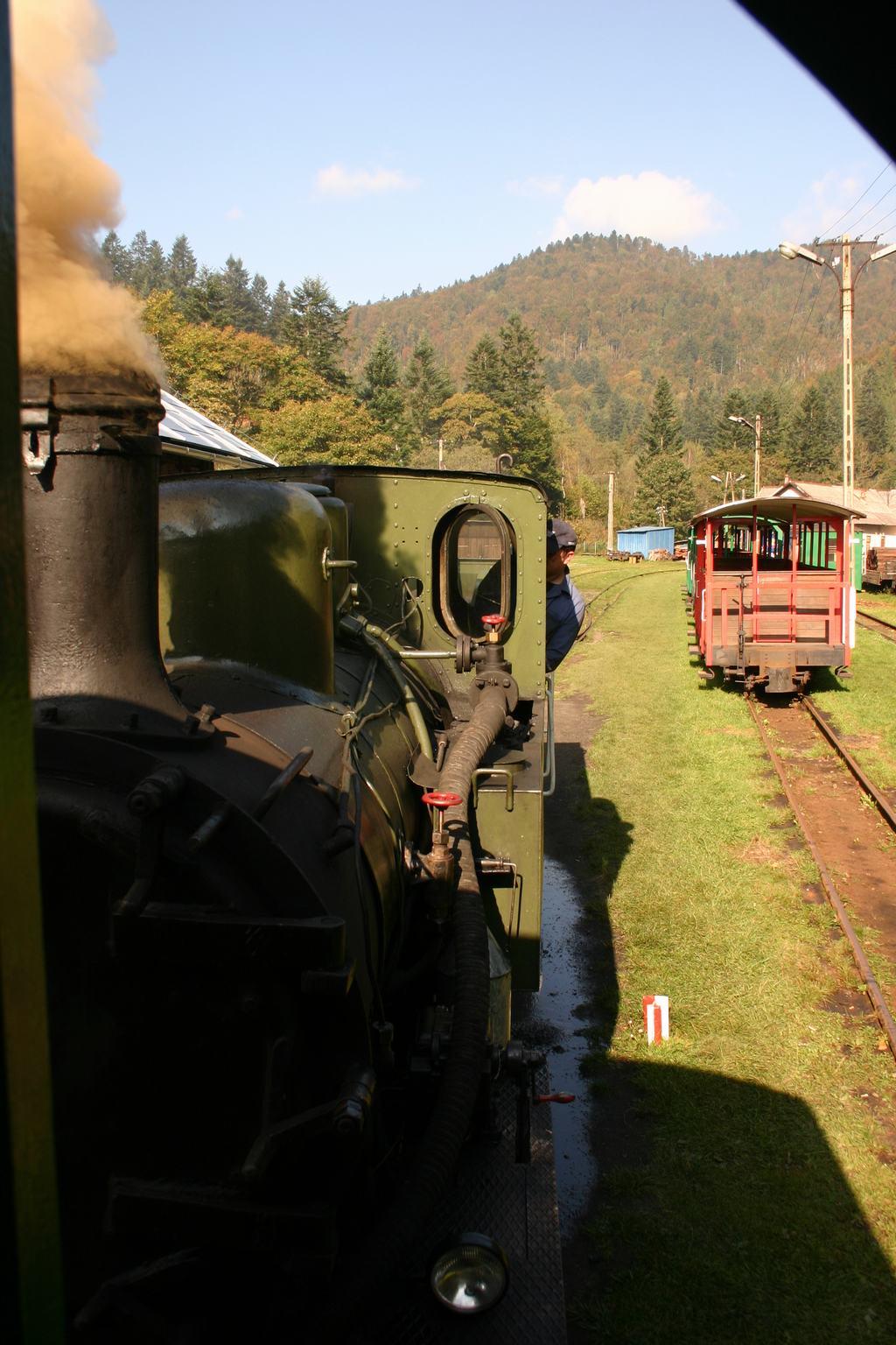 Niespodziewany kurs. Jedziemy na jesienny weekend do Cisnej, a ponieważ od strony zachodniej, proponuję współpasażerom, którzy tam pierwszy raz, żeby zajrzeć na stację w Majdanie. I niespodzianka. Właśnie do kursu przygotowuje się parowozik i trzy wagoniki. Dość niespodziewanie, bo przecież wrzesień i czwartek… Ale korzystamy z okazji i zaraz kupujemy bilety. Tymczasem skład się formuje.