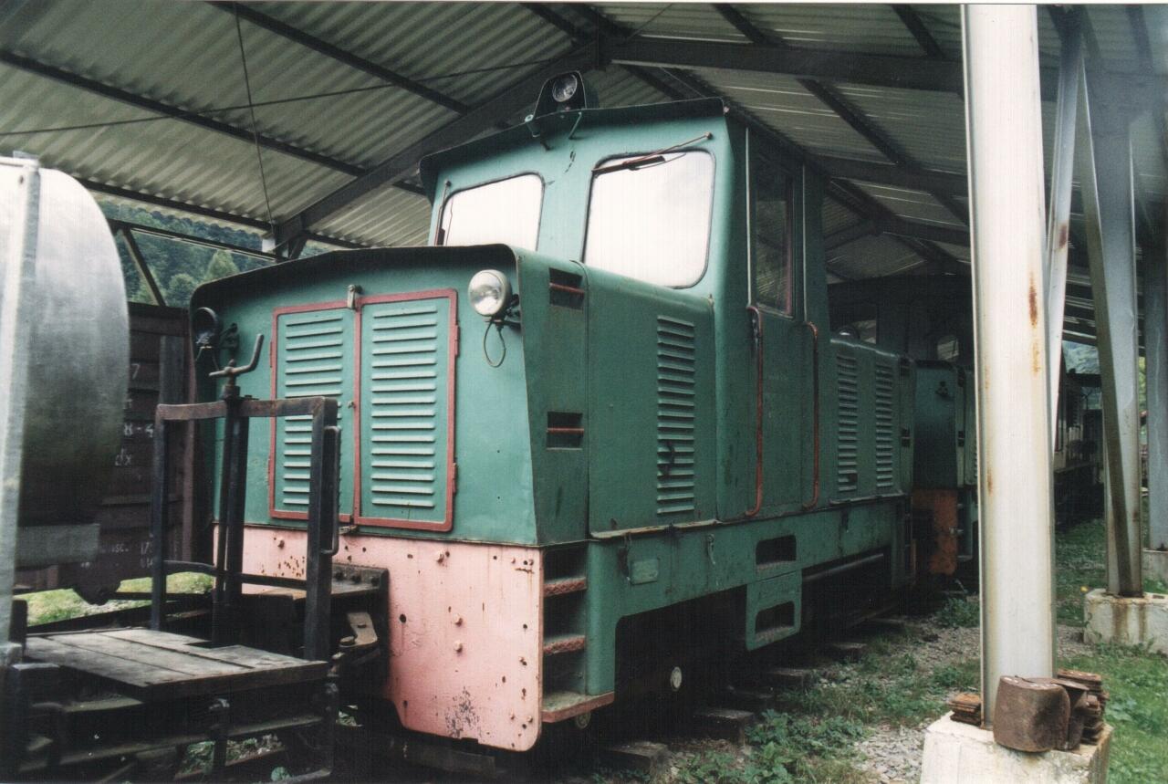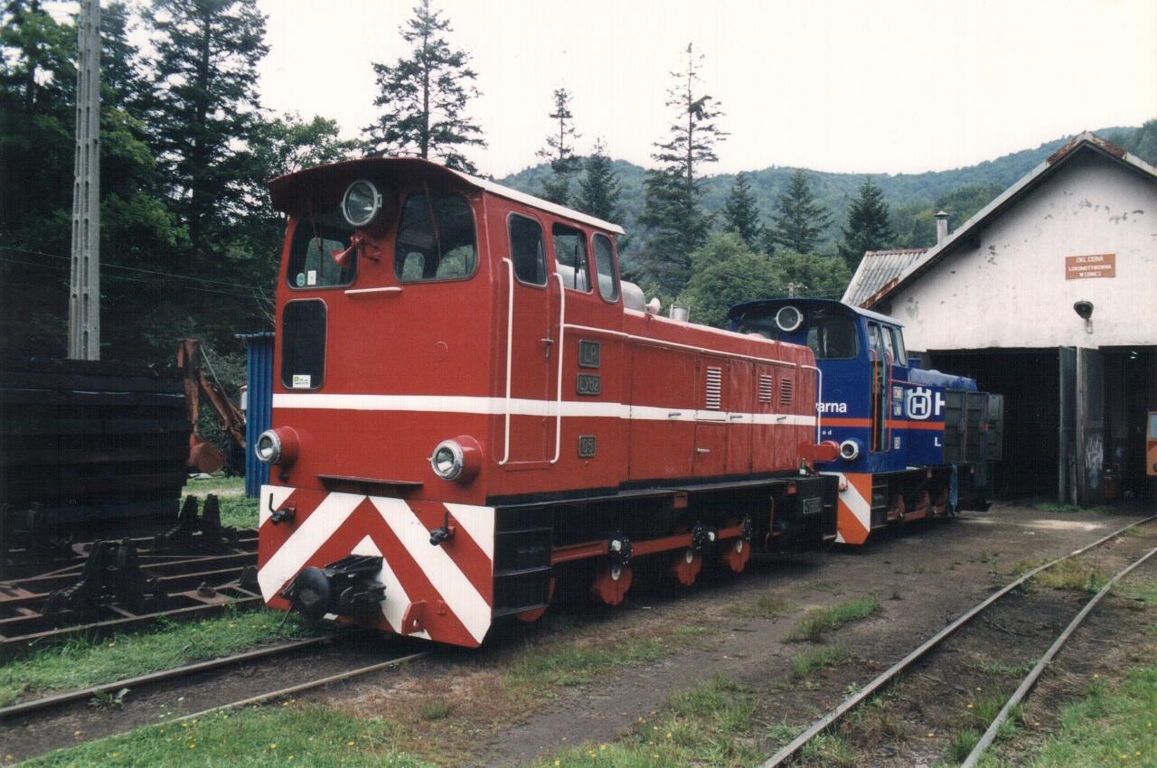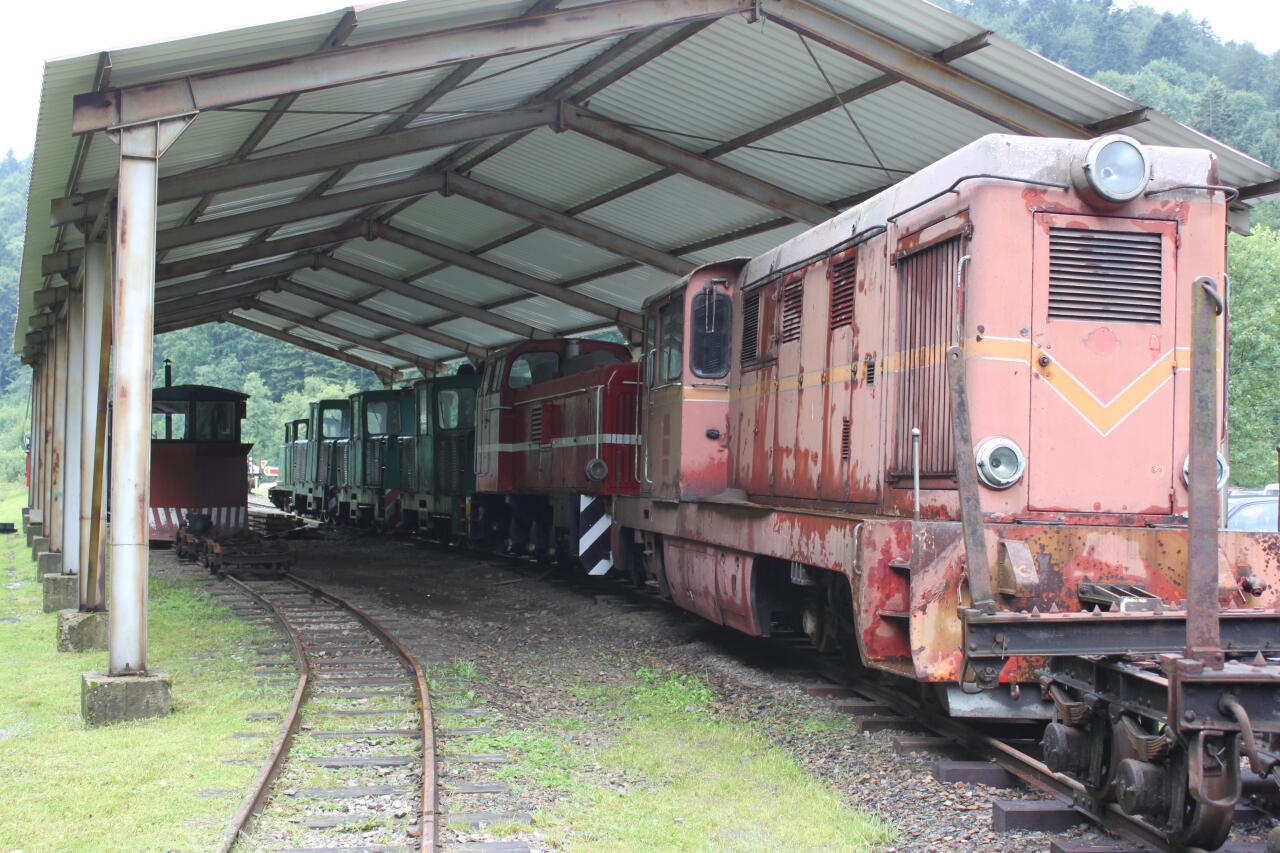 Wąskotorowe lokomotywy spalinowe pod zadaszeniem na stacji Majdan.