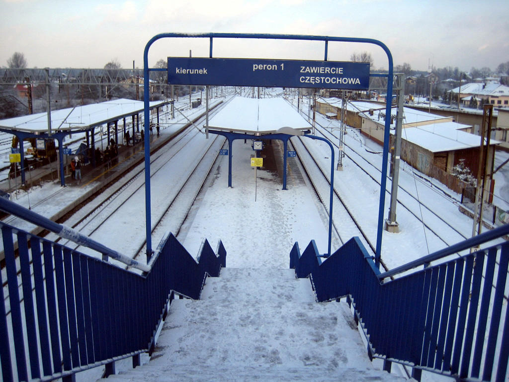 Zejście na peron 1 z kładki nadziemnej. Jest o peron w kierunku Zawiercia i Częstochowy.