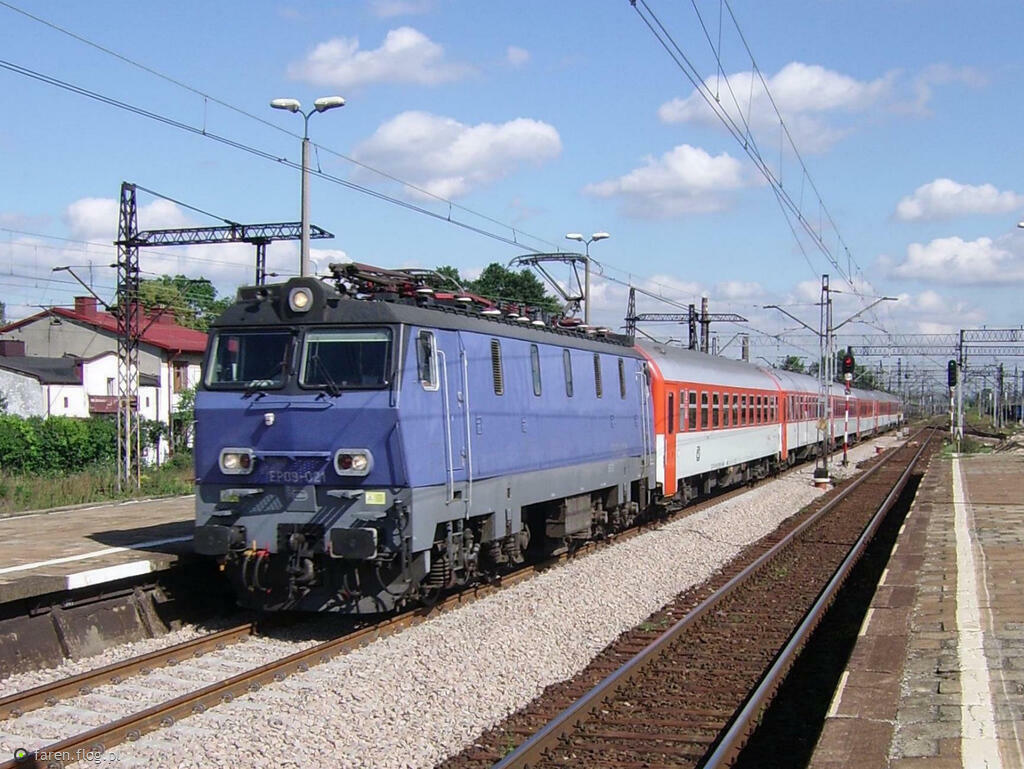 EP09-021 z pociągiem spółki PKP Intercity mija bez zatrzymania stację w Łazach.