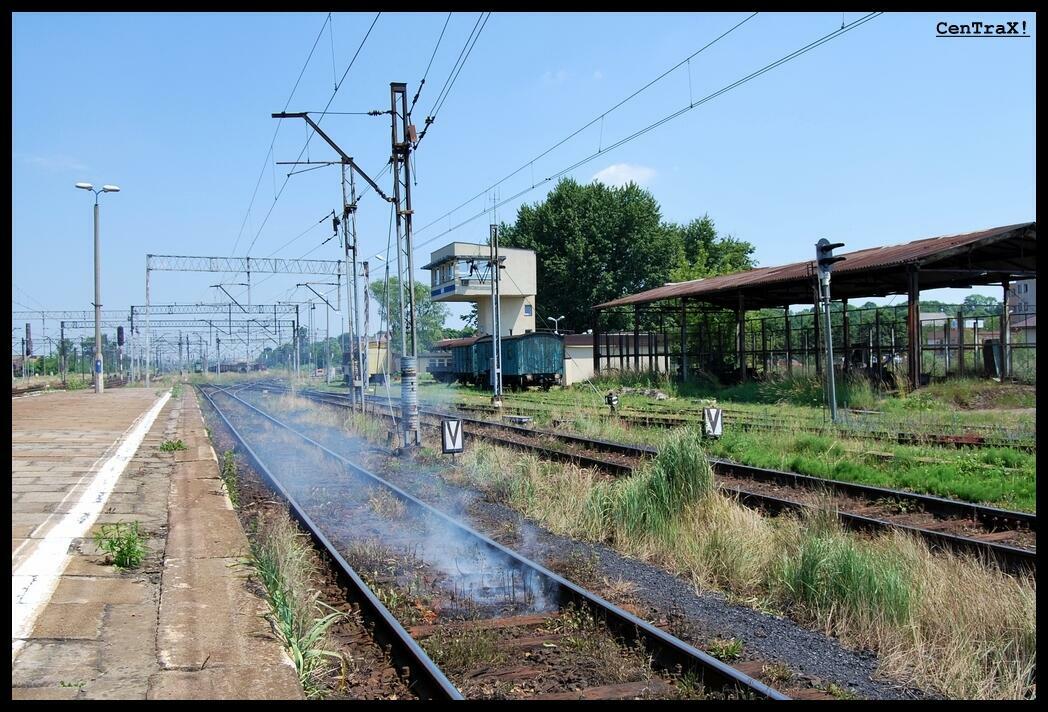 Widok w peronu 1 w stronę wylotu na Zawiercie. W tle nastawnia ŁB, a pożar wywołany został przez manewry stonki.