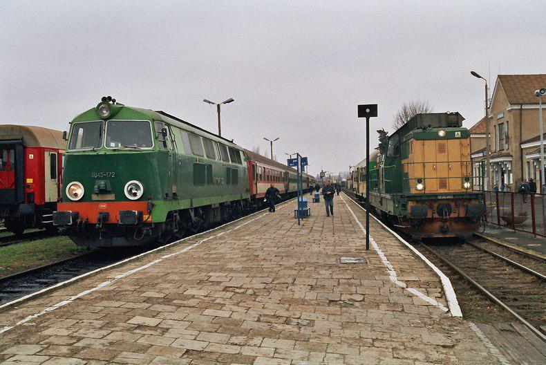 Archiwalna scenka kolejowa na stacji Zamość: Z lewej suczka przyprowadziła pociąg z Wrocławia, z prawej Ceausescu czeka z krótkim składem do Hrubieszowa, na który przesiadało się wielu pasażerów wrocławskiego pociągu. Motyw znany mi osobiście, kiedy rozespany podróżny musiał zrywać się w Zamościu i zmieniać cieplutki pociąg pośpieszny na często wyziębioną bonanzę. Widok w kierunku zachodnim (Zawada). Zdjęcie zamieszczono dzięki uprzejmości Bartosza Sojdy.