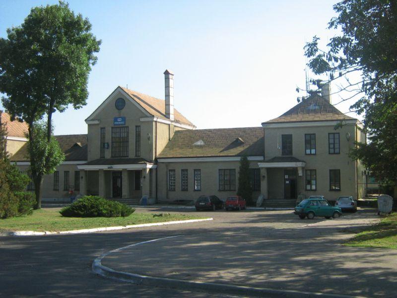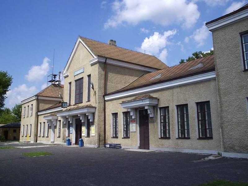 Widok na budynek dworca od peronów. W lewo Zawada, w prawo Hrubieszów.