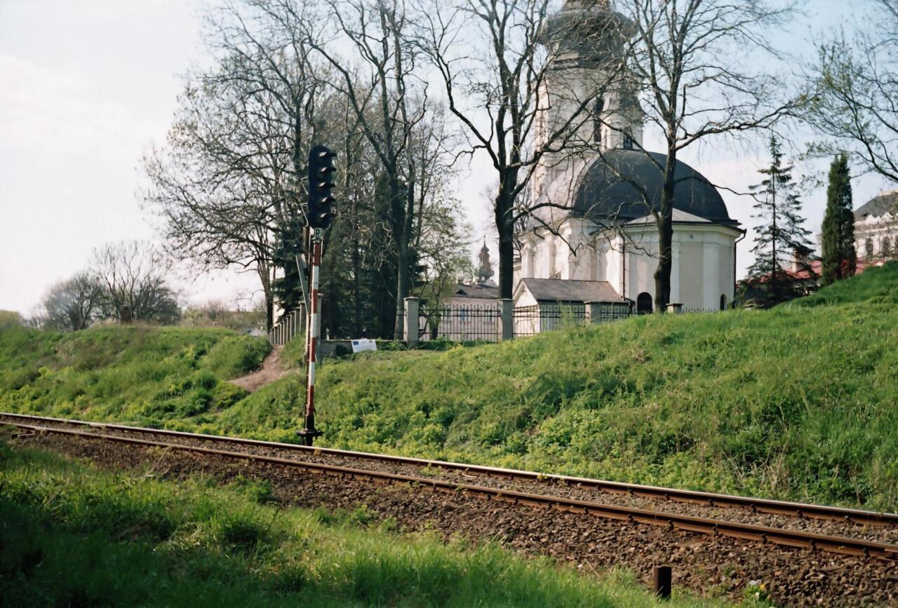 Semafor wjazdowy do stacji Zamość od strony wschodniej (Hrubieszowa). W tle kościół św. Mikołaja znajdujący się w pd.-wsch. krańcu zamojskiej Starówki.