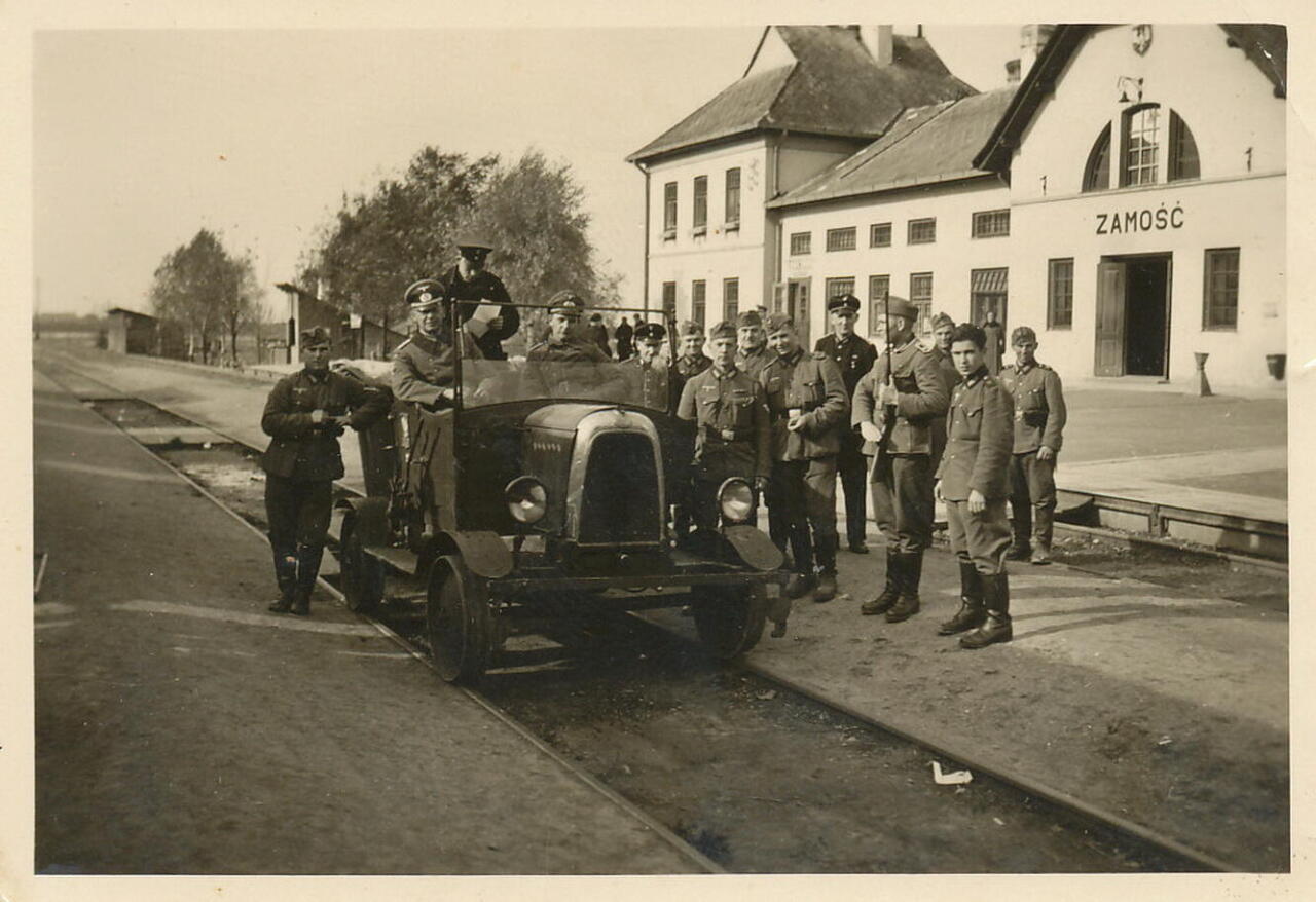 Niemieccy żołnierze przy drezynie bojowej (?) w peronach stacji Zamość. Widok w kierunku Zawady.