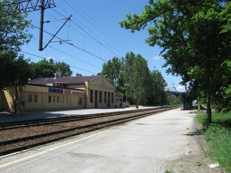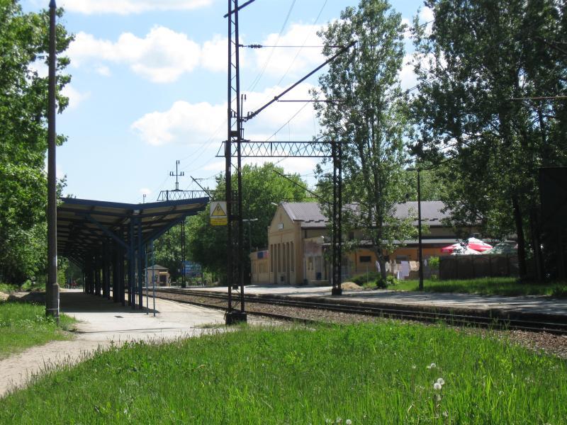 Widok na dawny budynek dworca (obecnie restaurację) oraz perony przystanku Stalowa Wola. Wjazd od strony Przeworska i Zwierzyńca.
