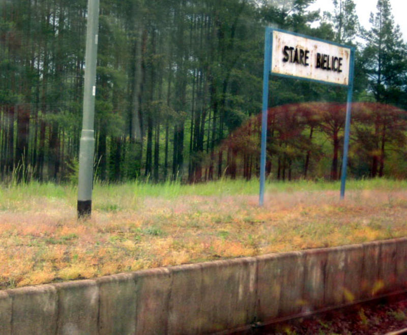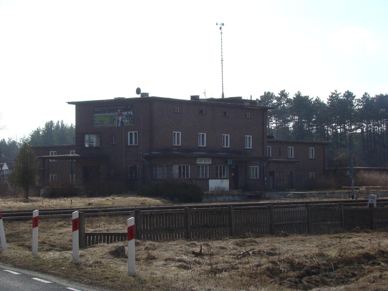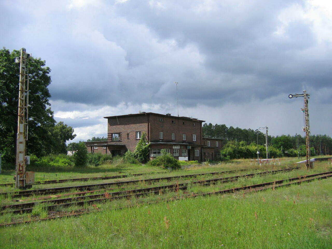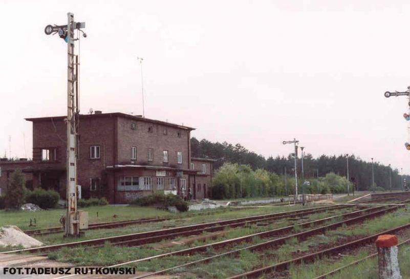 Na terenie czynnej jeszcze stacji kolejowej w Starych Bielicach. Z lewej budynek dworca mieszczący nastawnię dysponującą. Widok w kierunku zachodnim, od strony wjazdu z Krzyża.