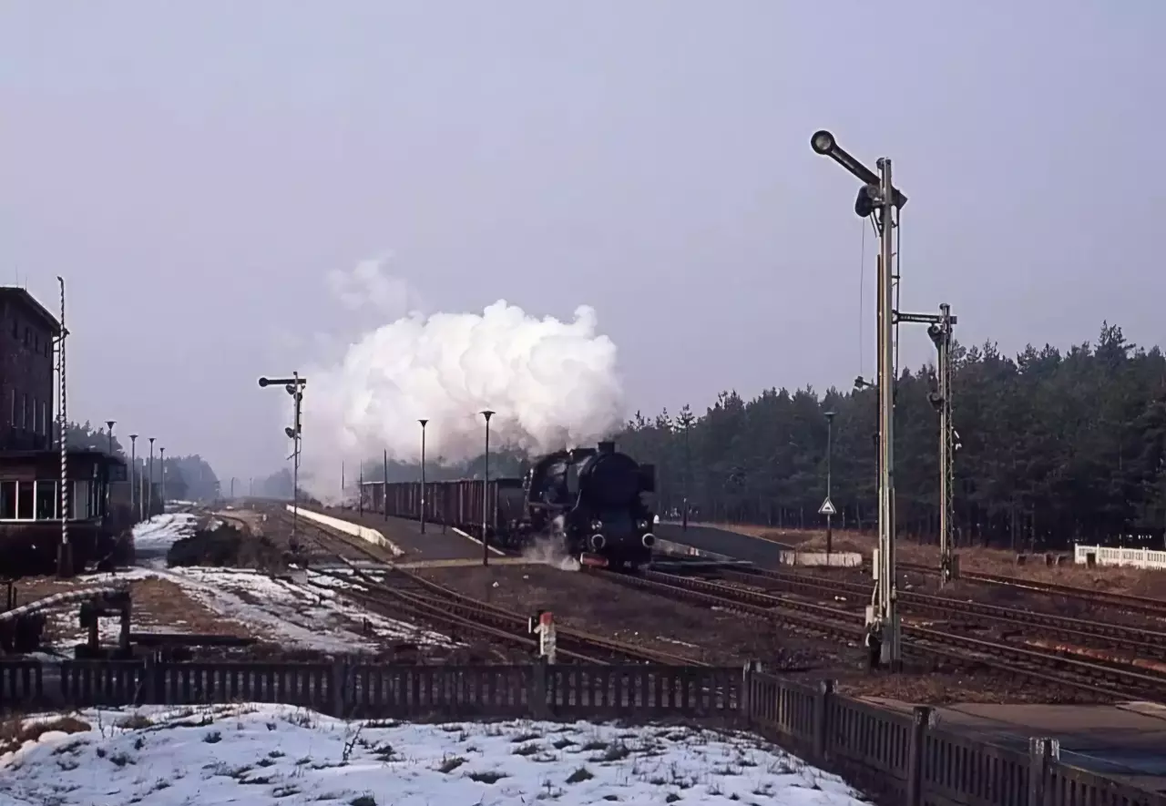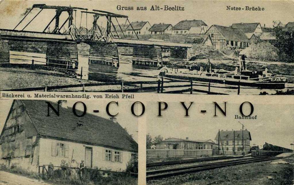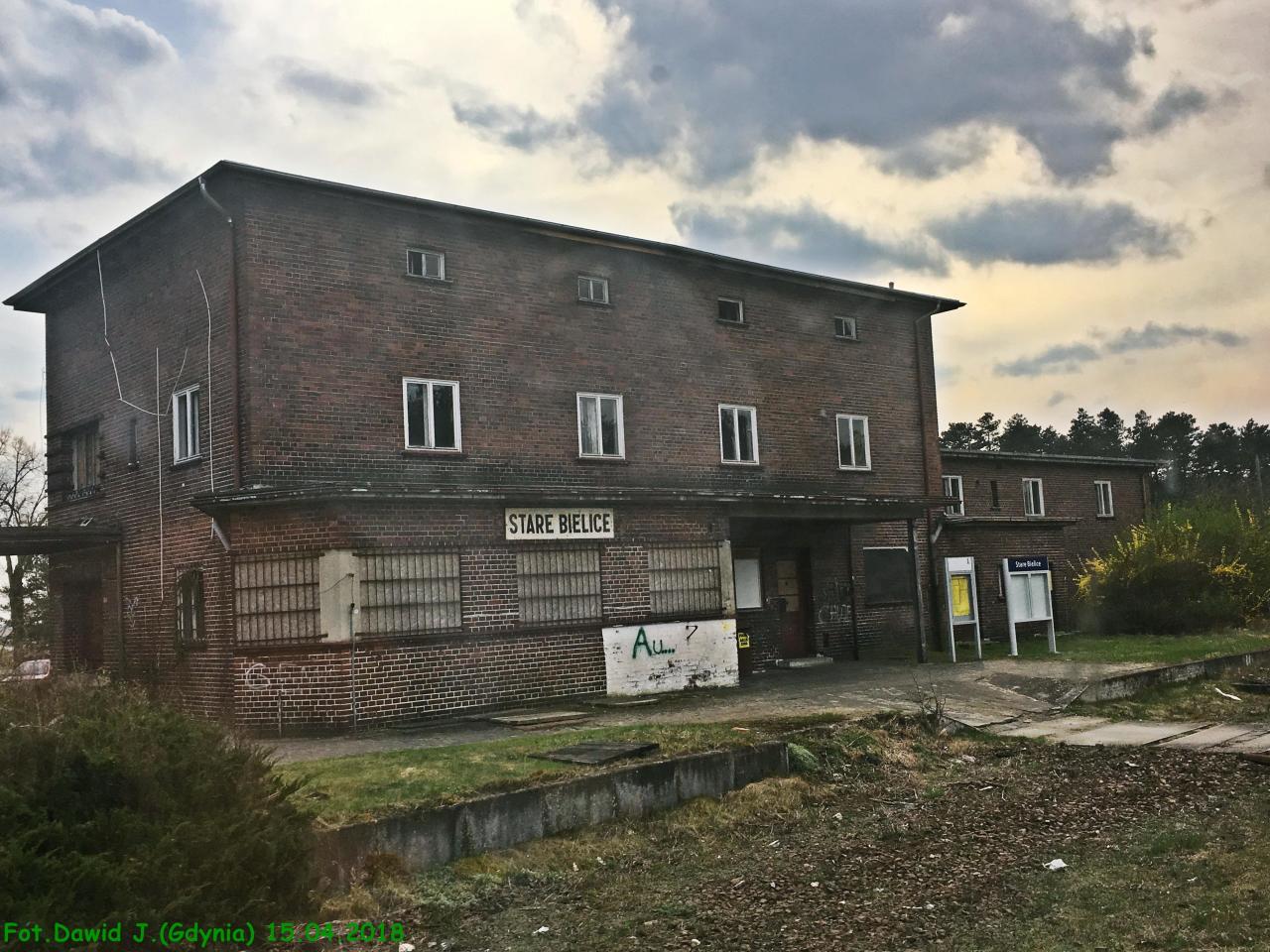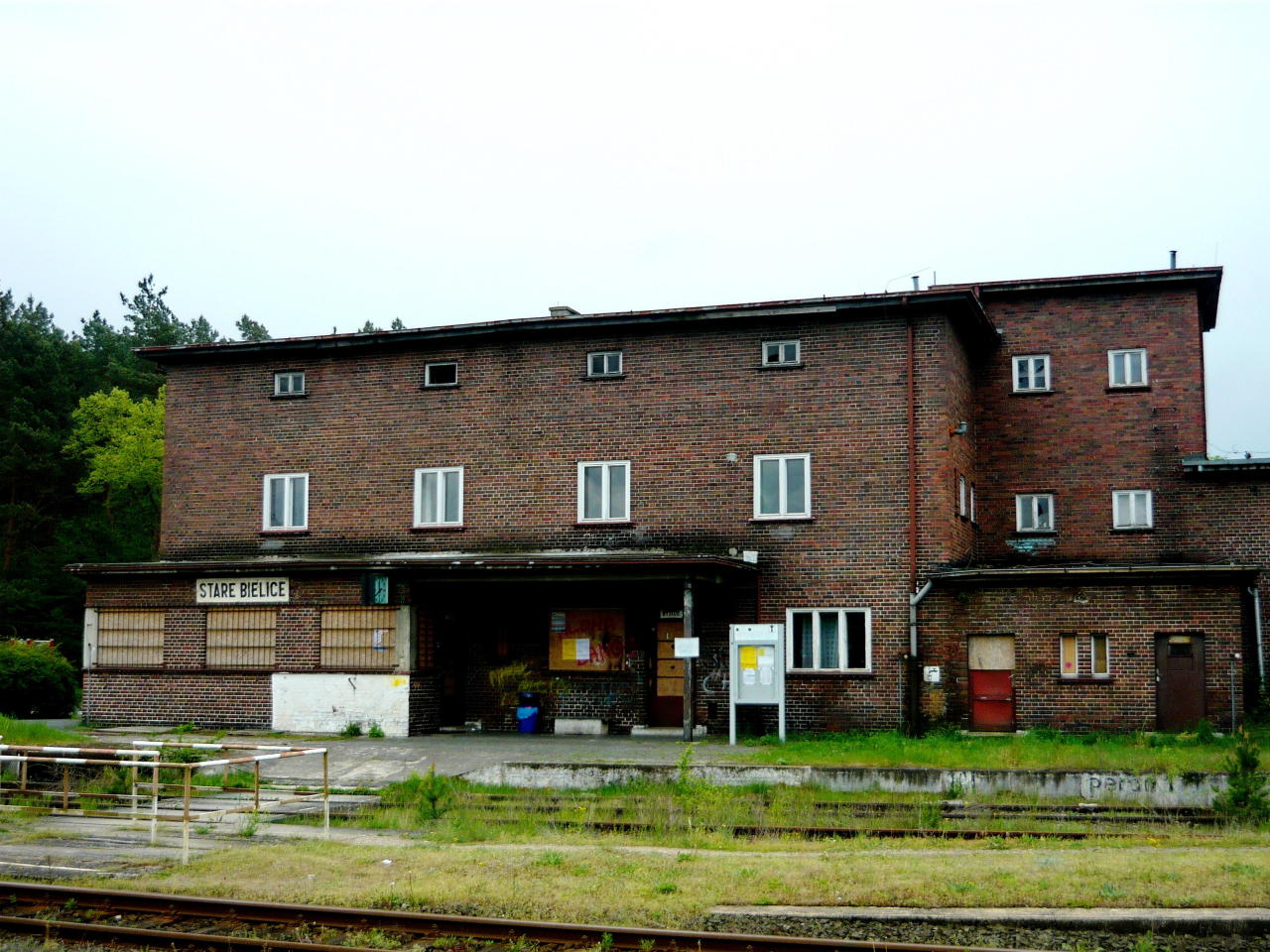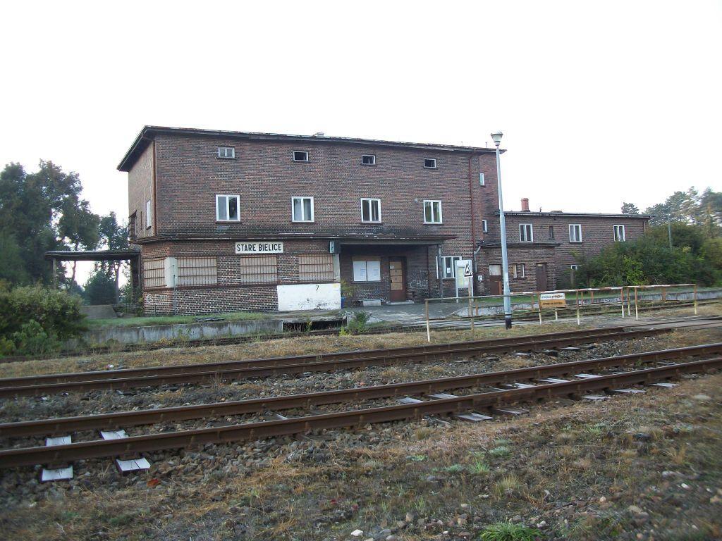 Stacja kolejowa Stare Bielice widok od strony wjazdu z Krzyża. Semafory unieważnione ale jeszcze stoją. W budynku dworca, w pomieszczeniu dyżurnego ruchu, urzędował wtedy dróżnik, który zamykał zapory na przejeździe z DW 174.