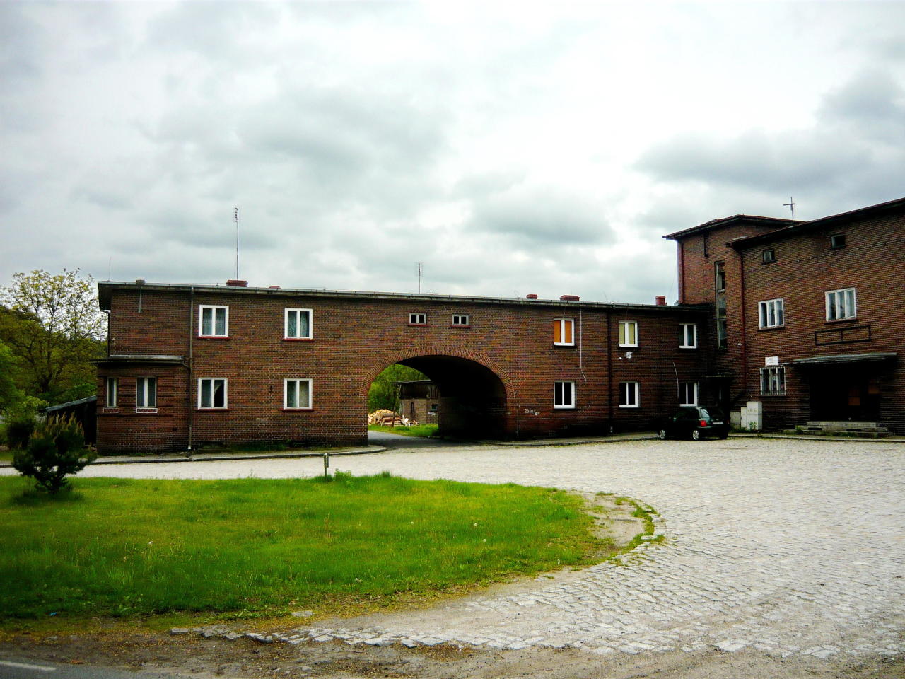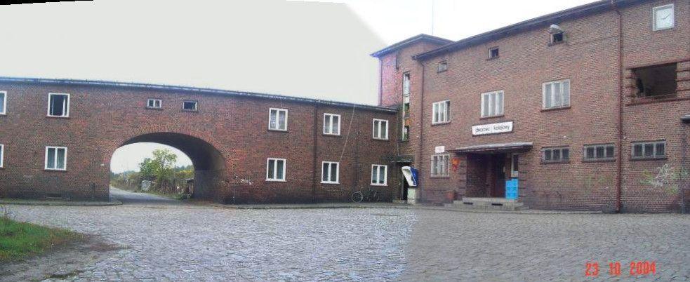 Widok na stację kolejową od strony wjazdu z Krzyża. Pierwotny budynek dworca kolejowego i obiekt mieszkalny; oba zastąpione bryłą z lat 30., w czasie budowy linii do Skwierzyny.