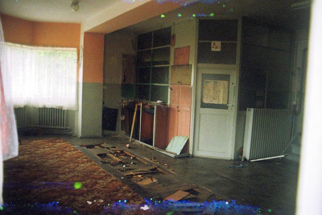 Stare Bielice, wnętrze zamkniętej poczekalni, po prawej reklama batonów Mars, Bounty, Snickers itp. z lat '90;