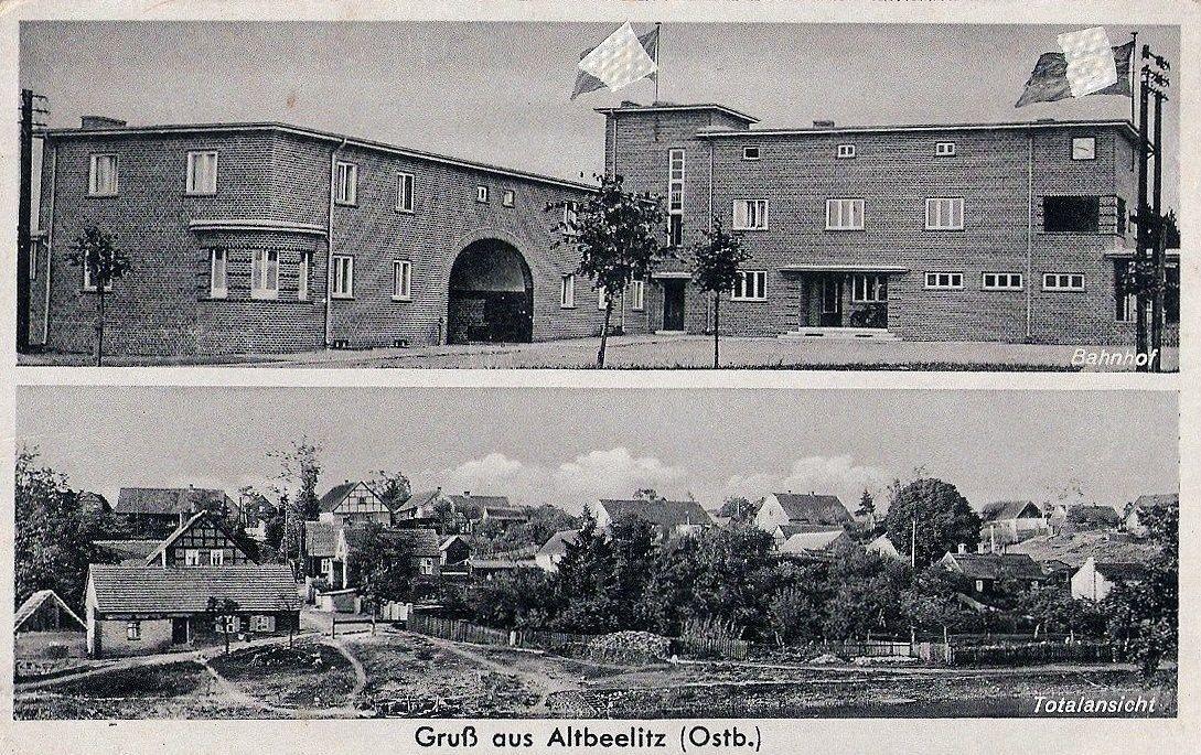 Dawna stacja Stare Bielice. Widok na budynek dworca i perony od strony wjazdu z Krzyża.