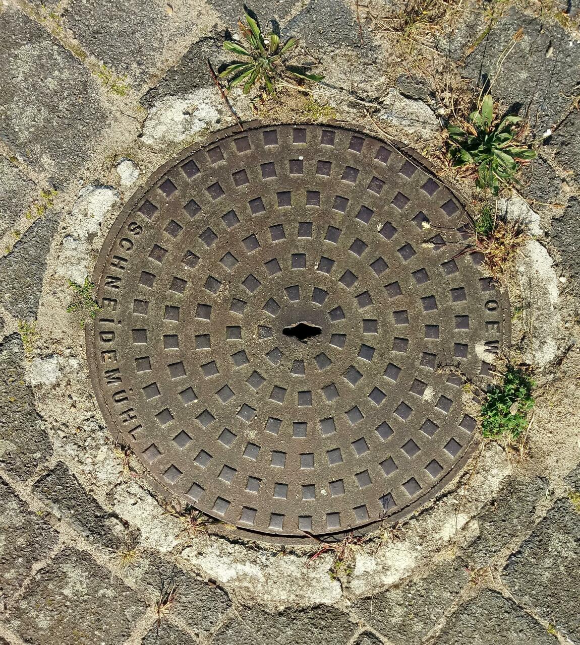 Pokrywa z niemiecką nazwą Piły znajdująca się obok budynku dworcowego.