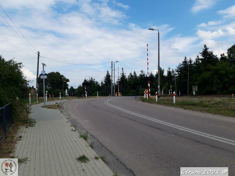Widok na przejazd przez al. Śliwkową w Warzymicach. Tuż za przejazdem pozostałości stacji Warzymice. Widok w stronę Szczecina Gumieniec.