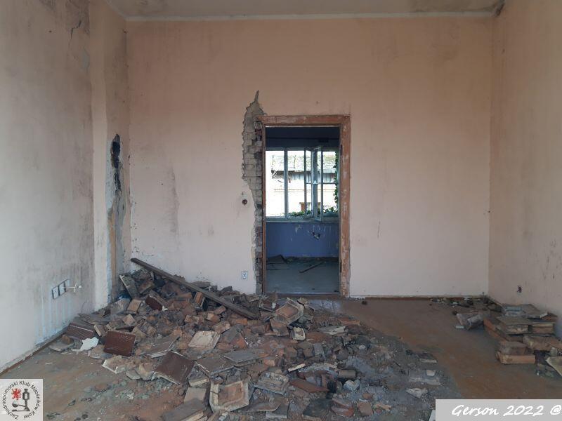 Wnętrze pomieszczenia, gdzie kiedyś znajdowało się pomieszczenie dyżurnego ruchu, czyli centralne pomieszczenie budynku od strony torów. To pomieszczenie ma zamurowane wąskie okna z widocznością wzdłuż torów (w kierunku Szczecina Gumieniec i w kierunku przeciwnym).