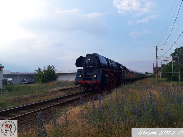 Pociąg "Sonderzug" prowadzony przez parowóz BR01 0509-8 w relacji Szczecin Główny - Berlin Lichtenberg - Cottbus (in der Lausitz) przejeżdża przez dawny przystanek w Warzymicach. Widok w kierunku Szczecina Gumieńce.