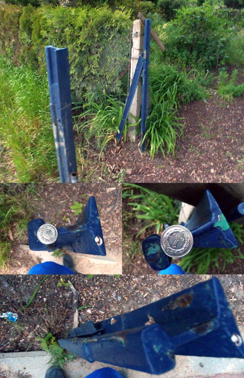 Słupki ogrodzeniowe od strony ulicy. Cechy niektórych szyn są, ale pod grubą warstwą farby, dlatego są nieczytelne.
