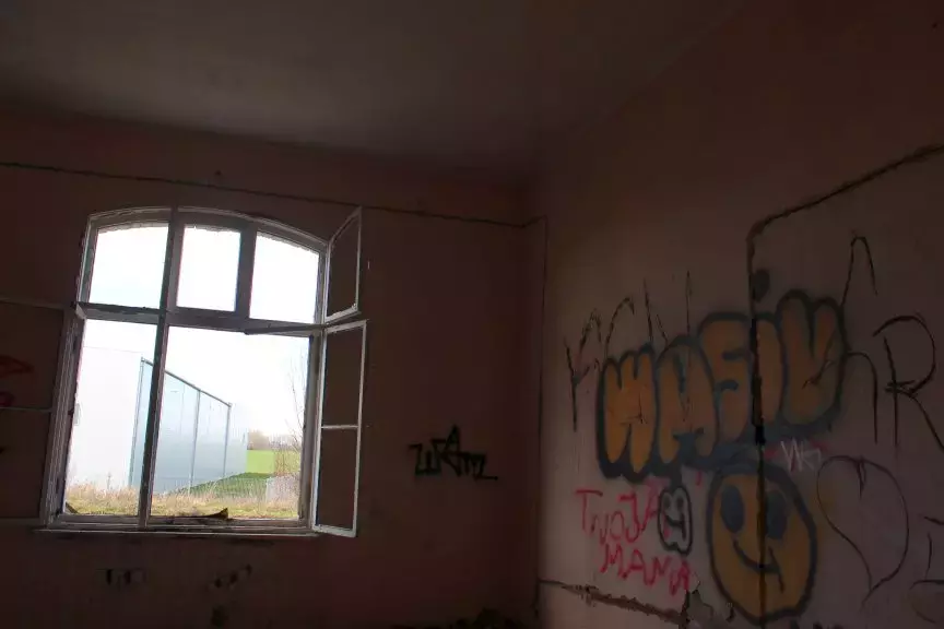 Wnętrze budynku mieszkalnego zlokalizowanego w bezpośrednim sąsiedztwie dawnego przystanku. W lewo Szczecin Gumieńce, w prawo Kołbaskowo.