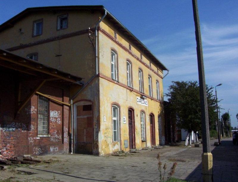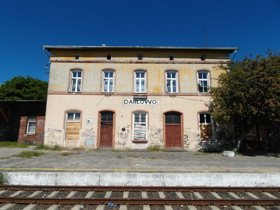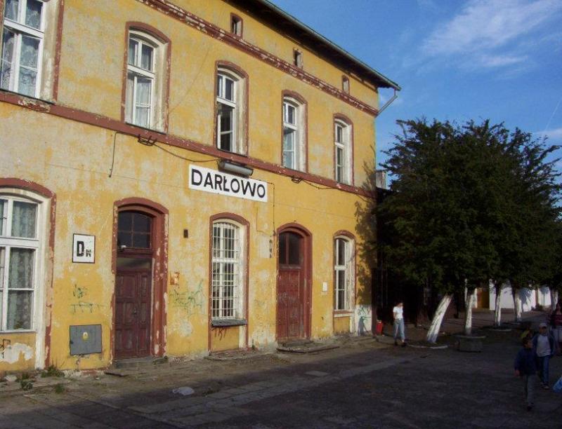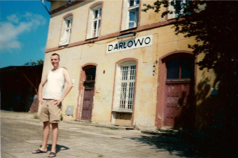 Zdjęcie przed budynkiem stacji PKP w Darłowie.