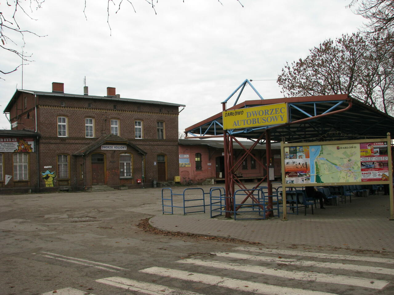 Widok na plac przed budynkiem dworca PKP w Darłowie.
