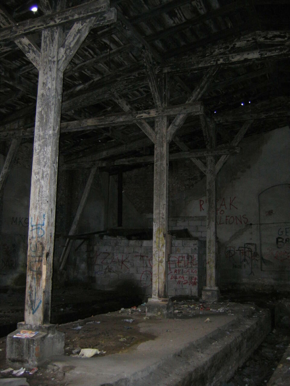 Wnętrze opuszczonej lokomotywowni.