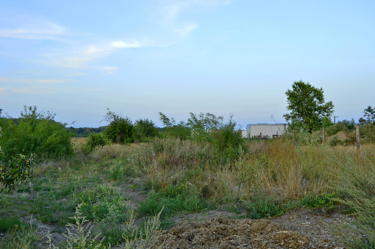 Równia stacyjna pozbawiona torów. Z lewej zamieszkały budynek dworca i magazyn towarowy. Widok w kierunku Sulechowa.