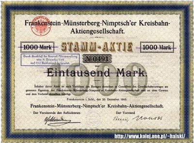 okręgu przemysłowego w węgiel z kopalń Nowej Rudy. Wpływ na rozmiar przewozów towarowych miała zwłaszcza niska przepustowość jednotorowej linii przedzierającej się przez masyw górski. Choć, czy za niską przepustowość można uznać średnio około 60 wagonów towarowych i 2500 osób (stosownie do statystyk przewozowych z 1913 roku i obowiązującego wówczas rozkładu jazdy) na dzień? Rozczarowanie udziałowców wynikało raczej z wysokości dywidendy, gdyż trudny profil linii, a zwłaszcza filigranowe konstrukcje mostów wymagały znacznych wydatków na utrzymanie. Powyższe przesłanki jak widać nie okazały się przeszkodą dla nakreślania planów uzyskania dostępu do kolejki od strony Ząbkowic Śląskich. W 1907 roku zawiązano spółkę akcyjną Powiatowa Kolej Ząbkowicko-Ziębicko-Niemczańska (niem. Frankensteiner-Münsterberg-Nimptscher Kreisbahn AG ), której akcjonariuszami prócz wymienionych w nazwie ówczesnych miast powiatowych było Państwo Pruskie oraz prywatna spółka Lenz&Co. z Berlina, specjalizująca się w budowie i eksploatacji kolejek. Była to ta sama firma która prowadziła przewozy na Kolejce Sowiogórskiej i Stołowogórskiej, a także na innych dolnośląskich kolejkach jak np. Kolejka Jawor-Malczyce, Kolejka Bolesławiecka, czy Kolejka Oławska. Powołanie spółki kolejowej miało zaspokoić lokalne potrzeby gospodarki rolnej i zapewnić komunikację zaniedbanym infrastrukturalnie okolicom. Spółka w lipcu 1907 roku otrzymała koncesję na budowę w oddaleniu od budynku dworca kolei państwowej tzw. Małego Dworca, wraz z infrastrukturą towarzyszącą oraz na wyprowadzenie z dworca torów w dwie przeciwne strony. Skorzystano w tym przypadku z ustawodawstwa dotyczącego budowy kolejek, choć nie obyło się bez trudności, gdyż szczególną czujność państwowego przewoźnika budziły wszelkie próby budowy kolejek normalnotorowych skracających odległość pomiędzy dwiema istniejącymi stacjami państwowymi. Ostatecznie ograniczenia to złagodzono i w dniu 3 listopada 1908 roku, tj. dwa dni po uroczystym otwarciu oddano do użytku całą, trójkierunkową linię o łącznej długości 49,8 kilometra.
